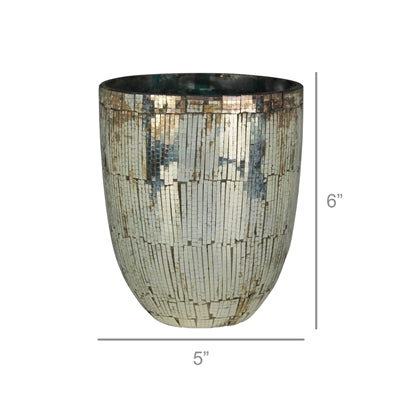 Narrow strips of silver glass are laid in a linear mosaic style to create a luminous and shimmering vessel for candle light or floral.