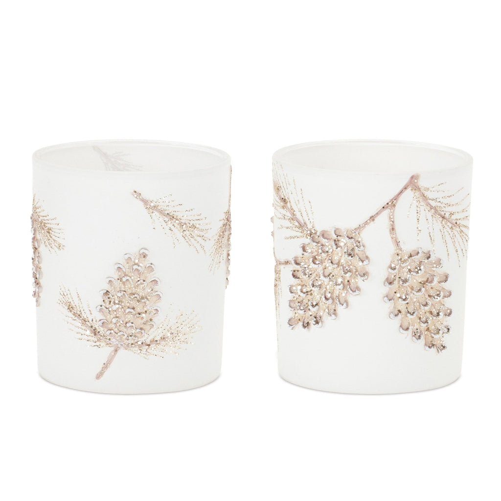 Delight your guests with this set of Pinecone Candle Holders. Featuring 6 pieces, this set is sure to fit right in with your holiday decor. The frosted glass finish paired with the chic gold glittered pinecone design is the perfect combination to create a stunning display. The quality glass composition is sure to last for seasons to come. Illuminate the piece by adding a real wax or LED candle. Candles sold separately, the set best fits a 2in votive candle.