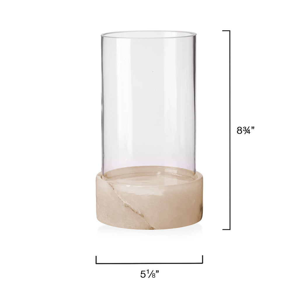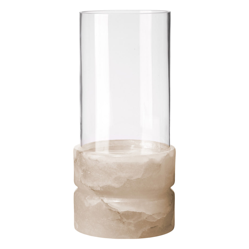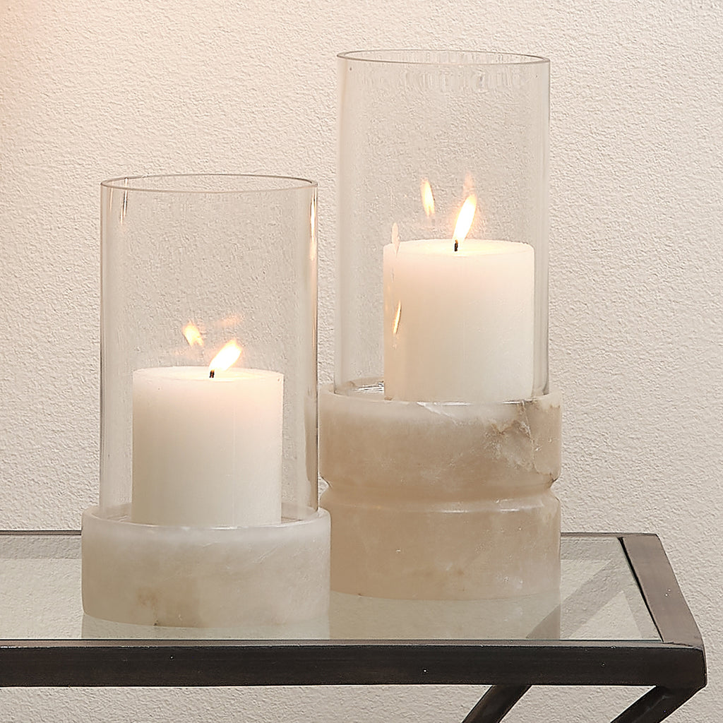 The alabaster's naturally occurring color variation and veining make this hurricane candle holder a unique statement piece. The heavy base contrasts strongly with its delicate glass hurricane to add both a strength and elegance to your décor. Alabaster is a natural stone with naturally occurring veining, colors, and patterns, so each piece is unique. Finish will vary.