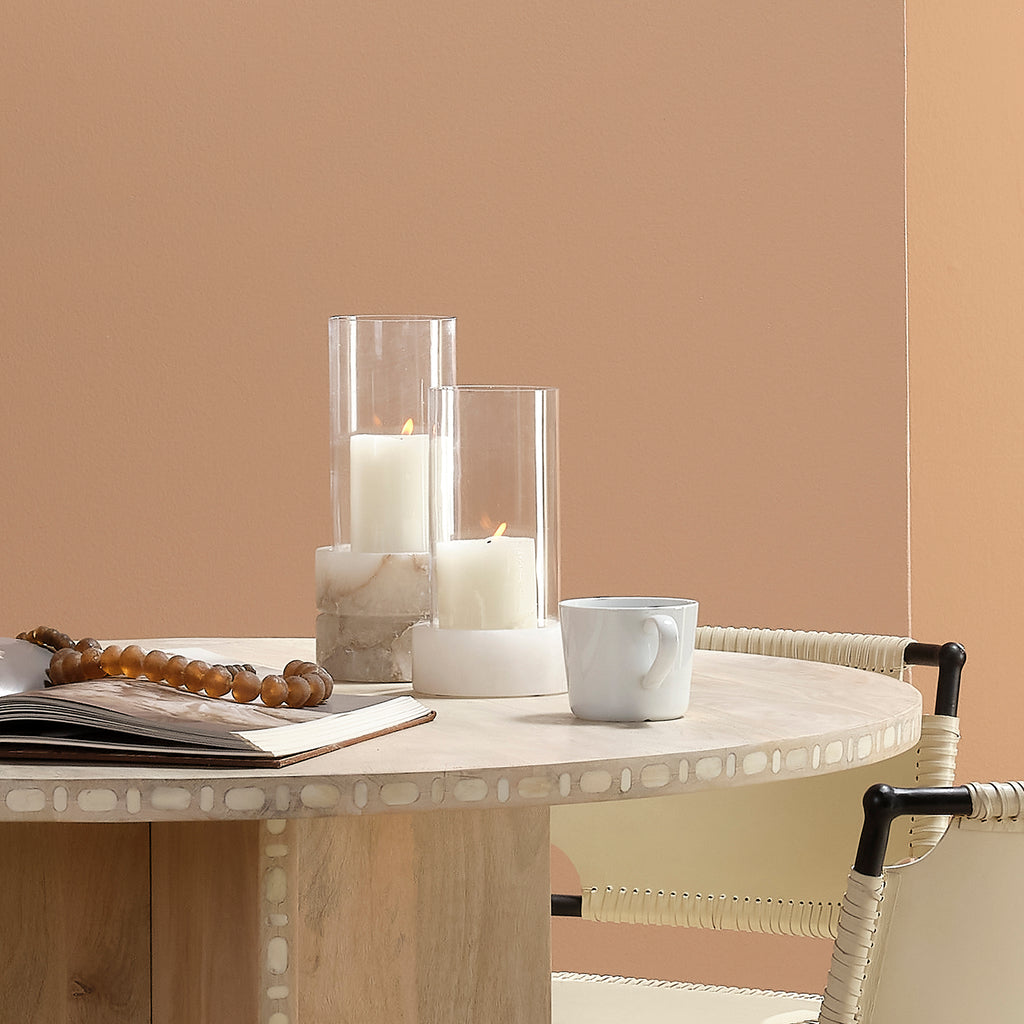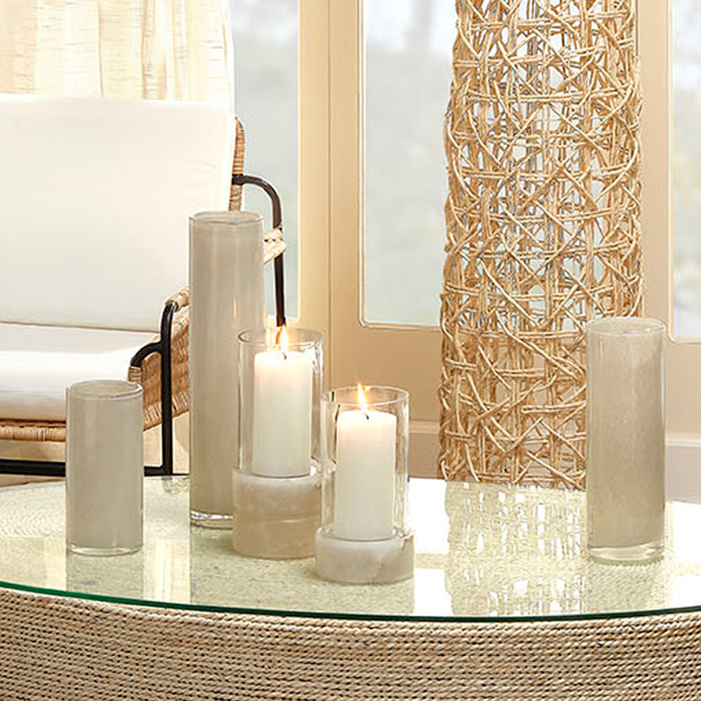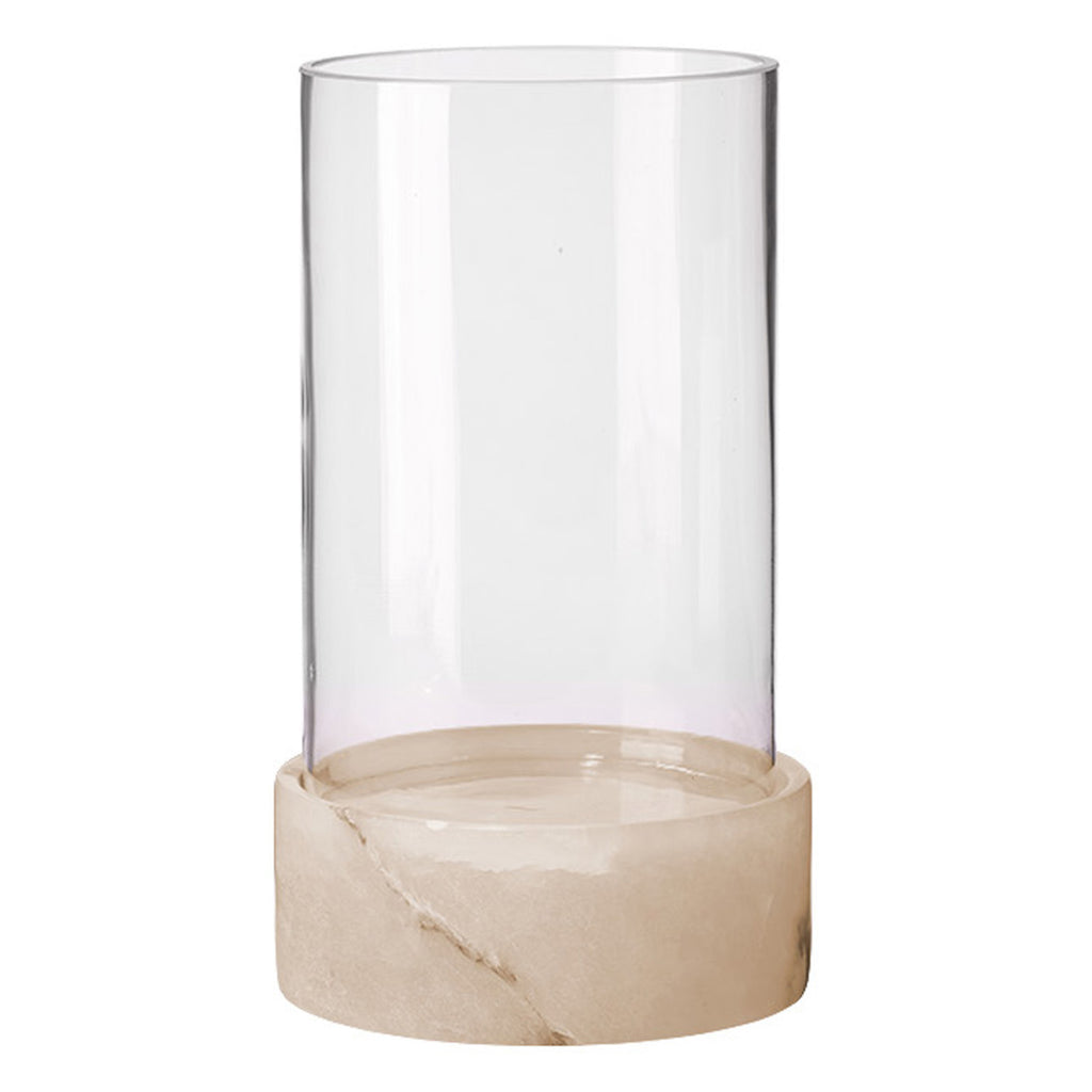 The alabaster's naturally occurring color variation and veining make this hurricane candle holder a unique statement piece. The heavy base contrasts strongly with its delicate glass hurricane to add both a strength and elegance to your décor. Alabaster is a natural stone with naturally occurring veining, colors, and patterns, so each piece is unique. Finish will vary.