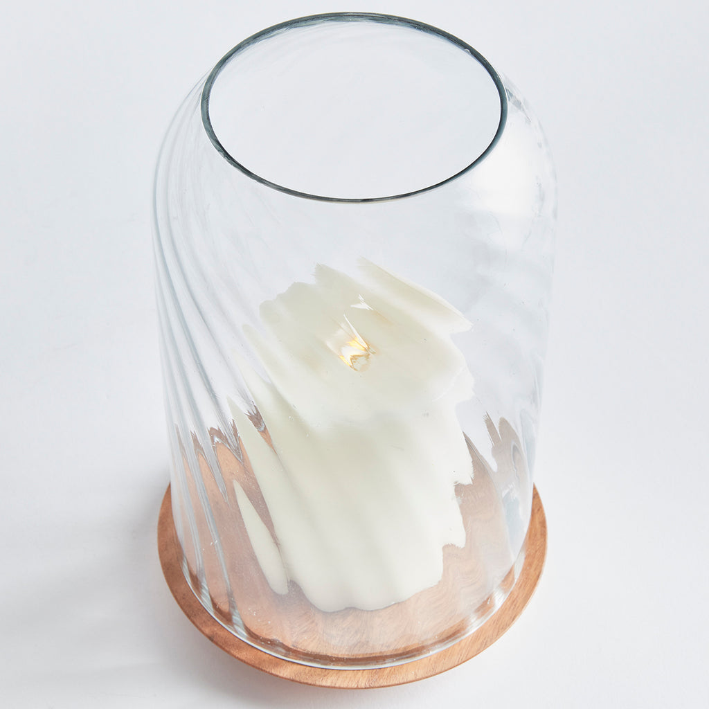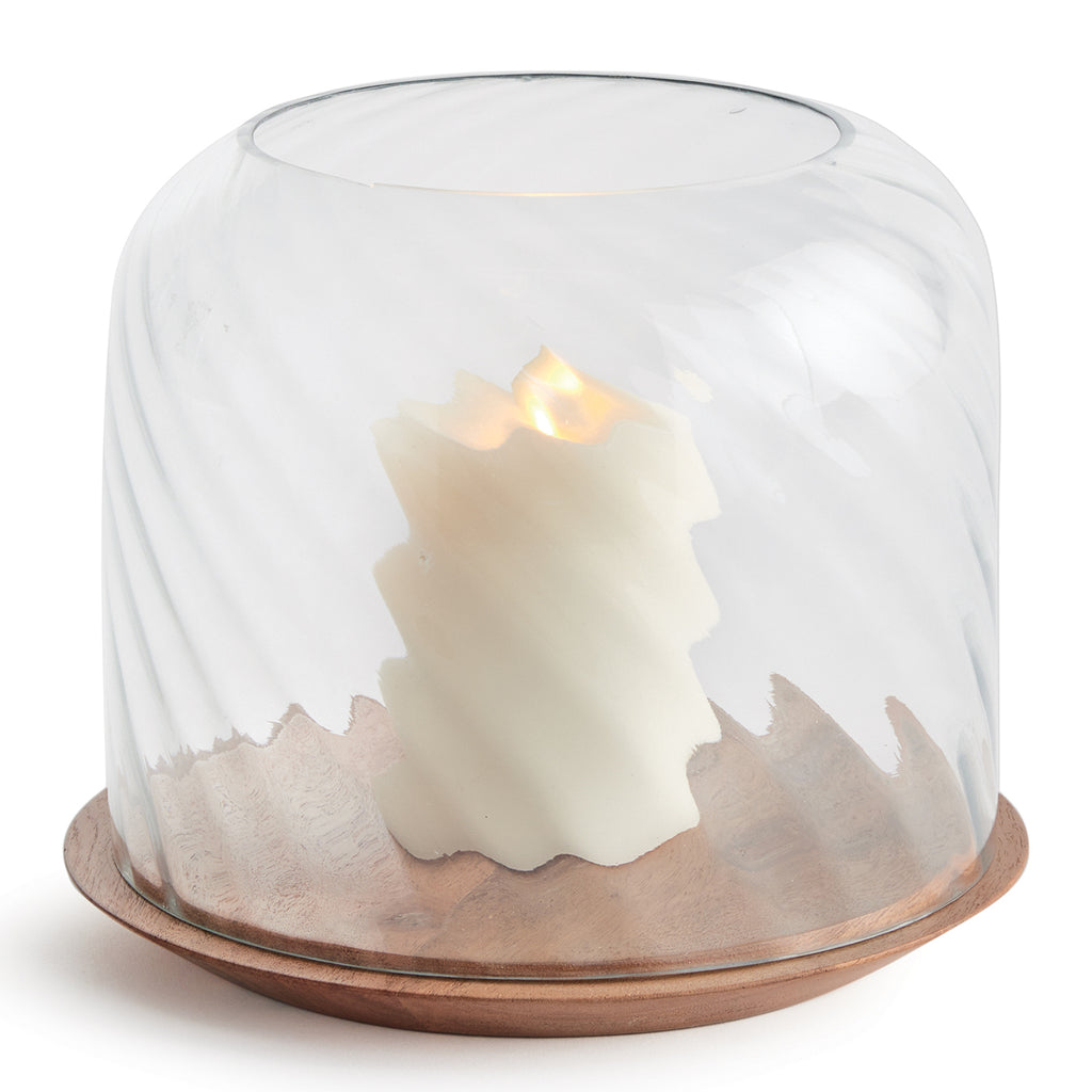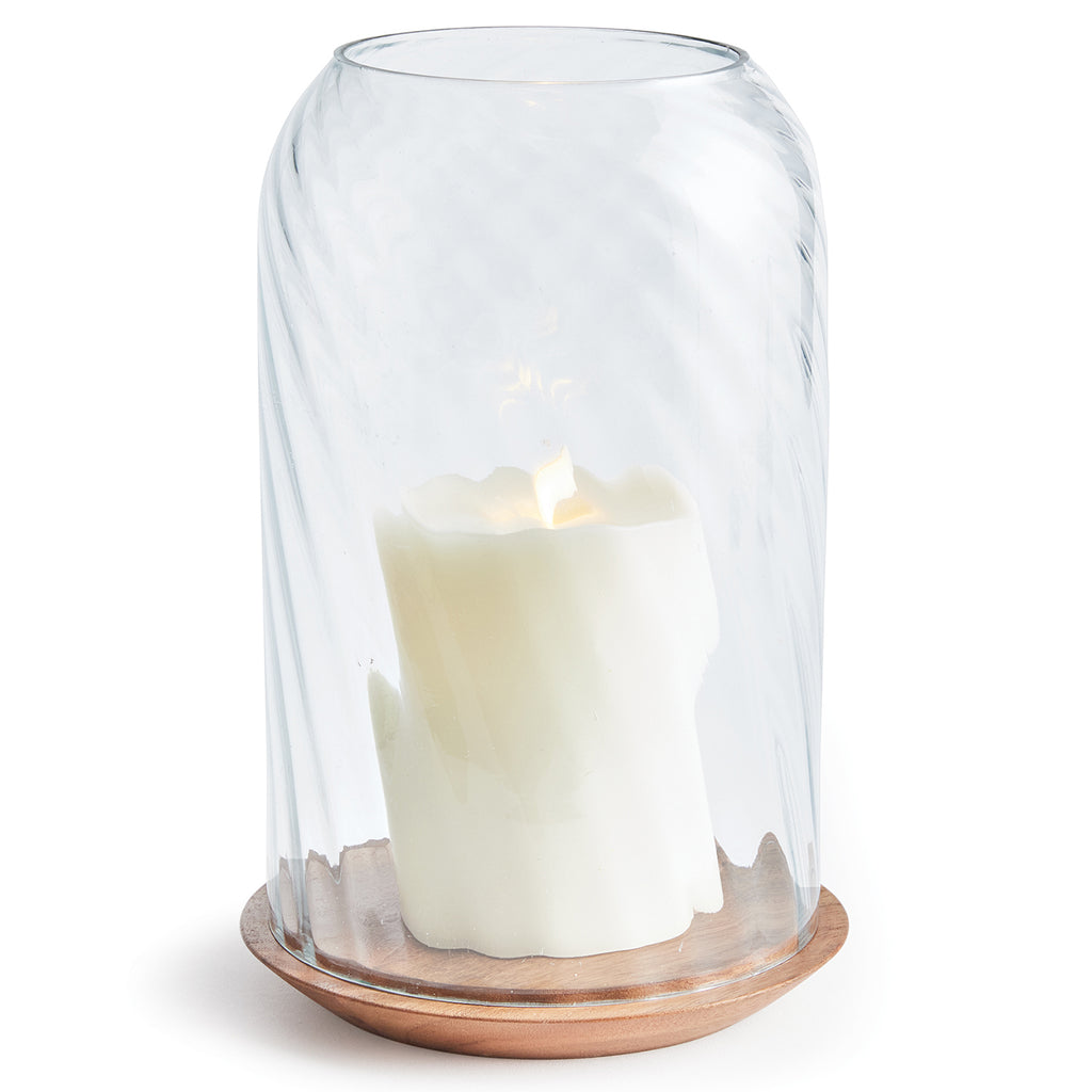 With an optic swirl blown glass vessel and turned acacia wood Base, this hurricane is the product of true craftsmanship. This beautiful juxtaposition of natural materials makes a stunning accent for kitchen table, console or ottoman.