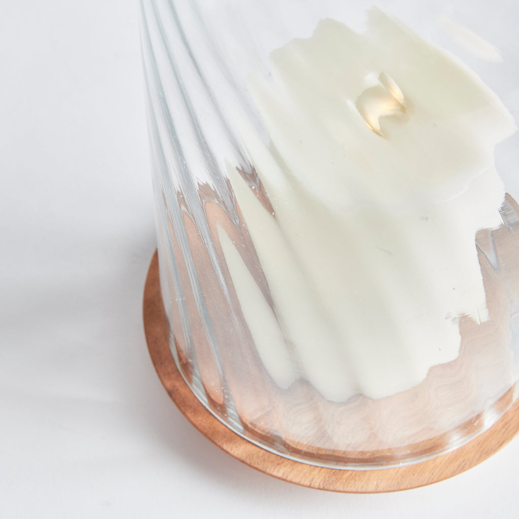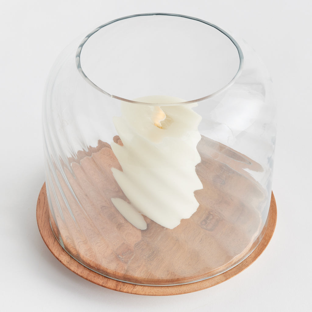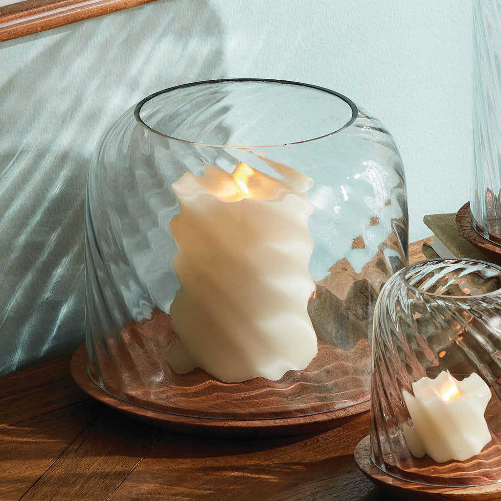 With an optic swirl blown glass vessel and turned acacia wood Base, this hurricane is the product of true craftsmanship. This beautiful juxtaposition of natural materials makes a stunning accent for kitchen table, console or ottoman.