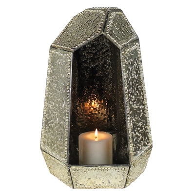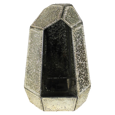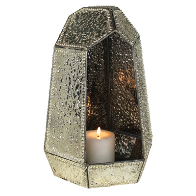 Multiple pieces of leaded glass with a deeply textured enameled silver finish come together to create a fascinating object that when lit inside with a candle, reflects and refracts the light.
