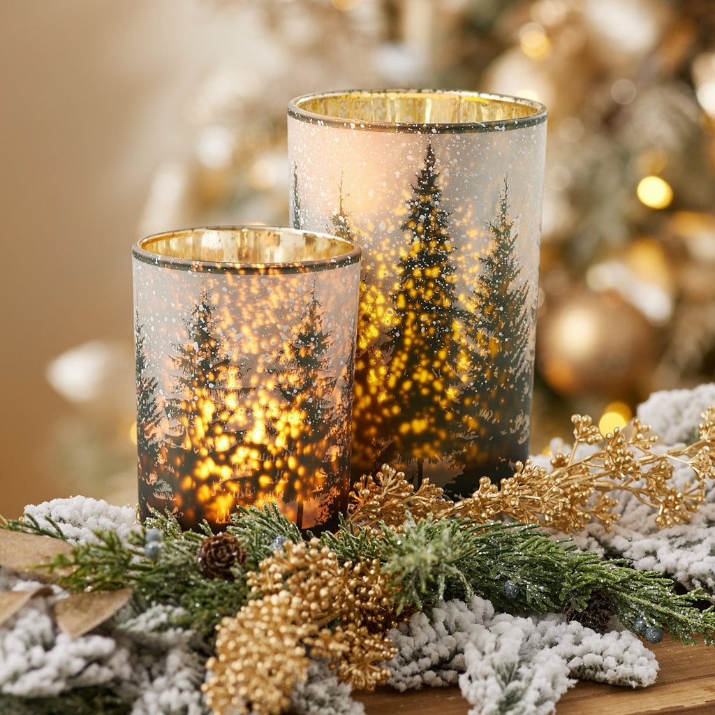 Add a rustic touch to your home this holiday season with this set of Frosted Pine Candle Holders. Featuring two assorted sizes, this set is great fit for your rustic or cabin lodge style of holiday decor. The printed pine tree design with speckled snowflakes and gold interior accent are the perfect combination to create a memorable display. The quality mercury glass composition is sure to endure for seasons to come. Illuminate the set by adding a real wax or LED candle to each holder. Candles sold separately, this set best fits a 3in and 4in votive or pillar candle.