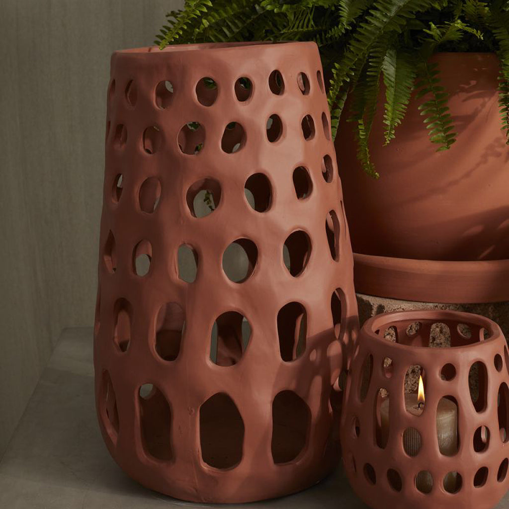 Create a dreamy outdoor space with the lightweight terracotta Alameda Lantern, featuring organic handmade cutouts. Place a citronella or pillar candle inside to ward off bugs & set the mood. Layer multiple sizes together for a cozy, dimensional glow.