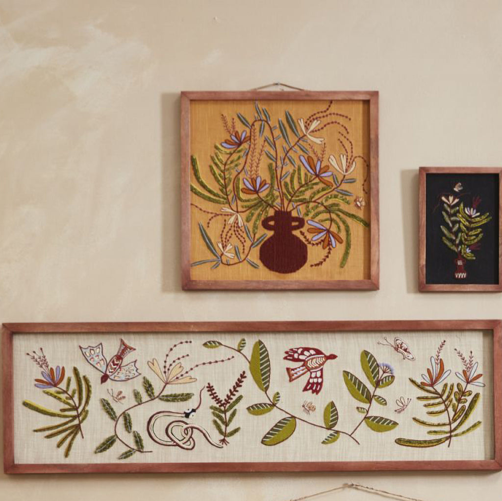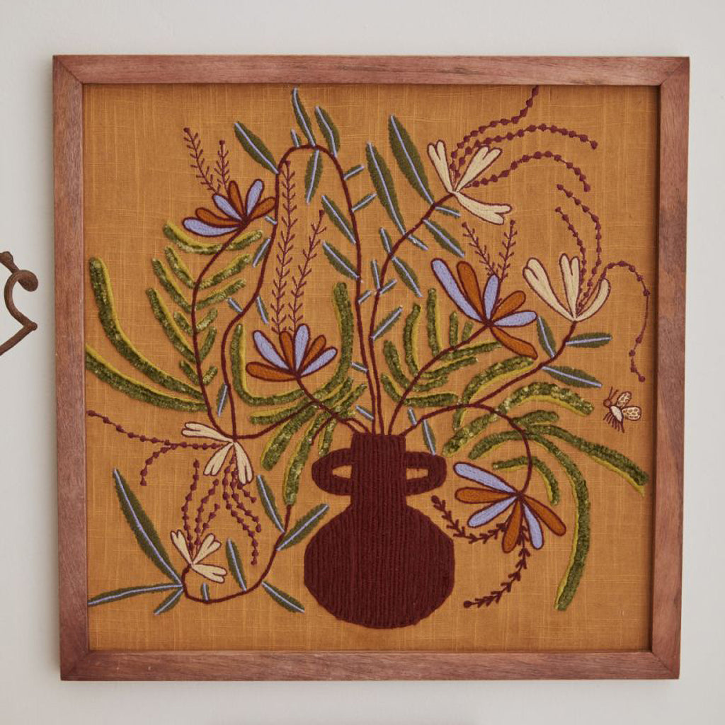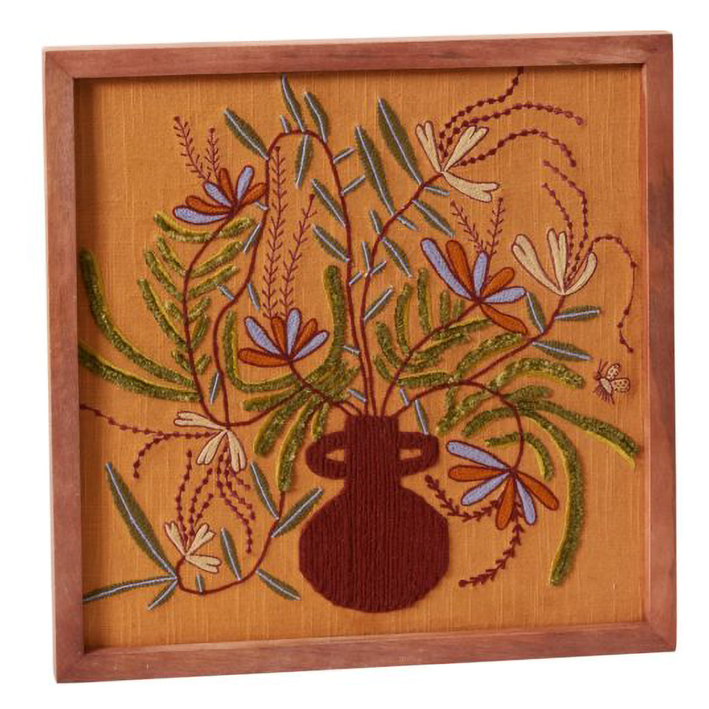 Artist Jessica Hiemstra livens up interior design with her folk art-inspired creations & mix of color & pattern. The square, embroidered Andalusia Wall Art is full of personality with its unique vase & floral design in a variety of stitched techniques on a slub cotton background. This decorative piece adds a rustic, artisanal touch to the wall.