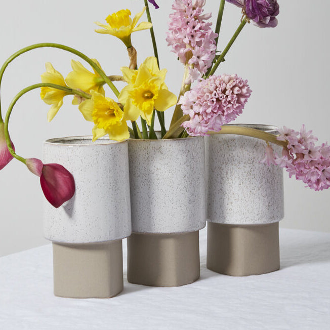 The Blakely planter features two-toned stoneware with natural bisque color, speckled cream glaze, and a rounded square silhouette.