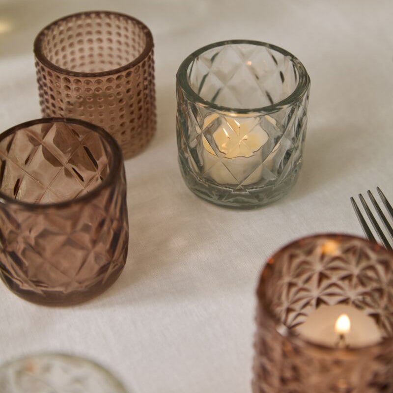 Bring a striking mix of patterns to wedding or event tables with the set of 3 peachy pink glass Pleasantry Votives, each with a different textural design that offer an organic yet cohesive look when layered together. One has raised dots, another has small raised diamond studs, and the third has a larger diamond pattern. All are the same size, perfect as a coordinated centerpiece with tealights, especially paired with the clear Pleasantry Votives.