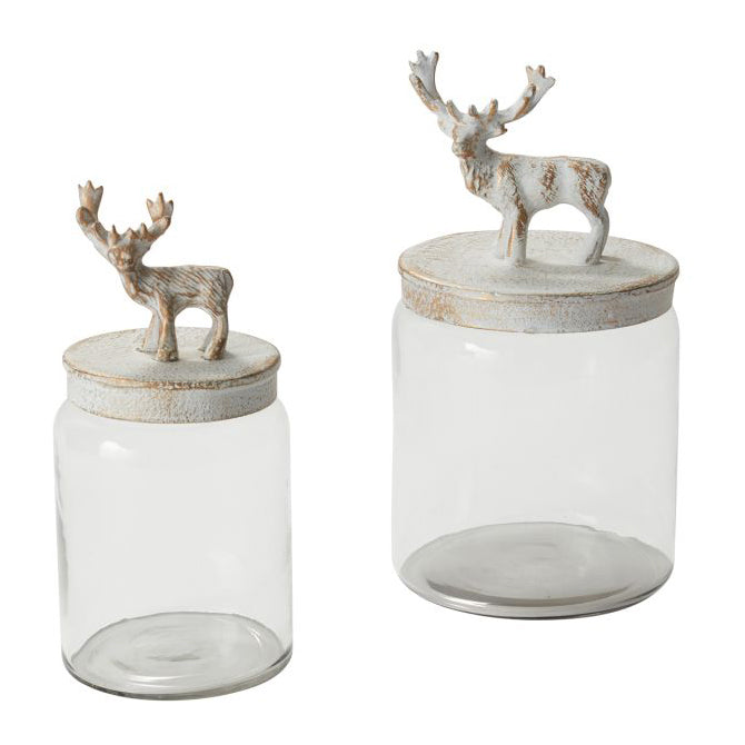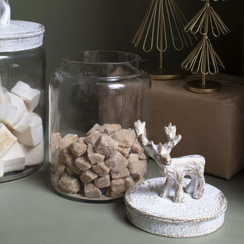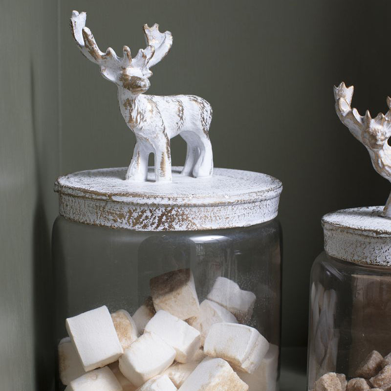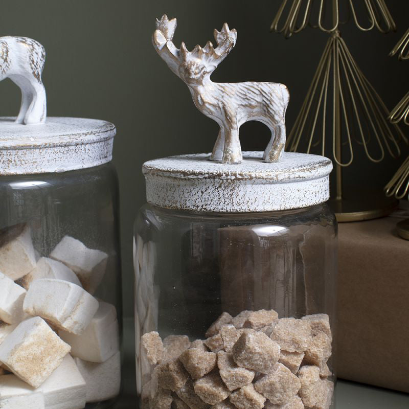 Store collected holiday goodies in the Renton Canister, a glass jar topped with a whitewashed aluminum lid. A deer figurine acts as the handle on the lid and is functional as well as decorative.