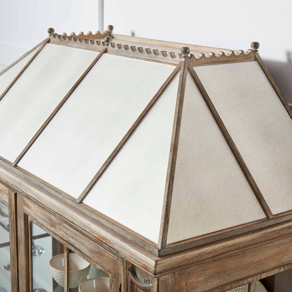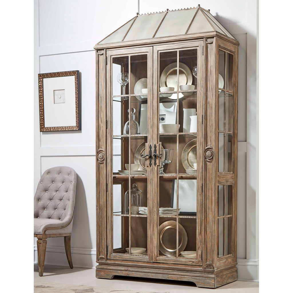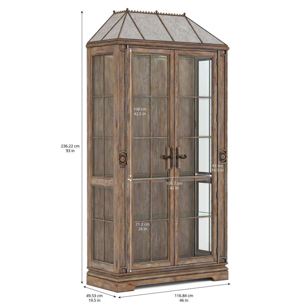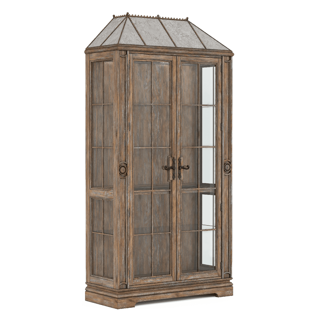 Step across the threshold of a new design frontier with the Architrave collection. Based on an architectural term that refers to a frame surrounding a doorway, this collection symbolizes a transition from history to the future. Architrave is historically inspired, reinventing the strong lines and classic symmetry of Neoclassical style from the Louis XVI period in France. Like the perfect frame complements a beautiful piece of art, the Architrave China Cabinet is a stunning showcase for your fine china and display pieces. The interior is softly lit with interior touch-operated LED lighting, to gently bathe items placed on the four adjustable glass shelves in just a hint of light. The rustic pine doors are accented with traditional paneling including small medallions and ornate oil rubbed bronze handles, and it is crowned by an angled top that recalls the gracefully sloped roofs of European cities.