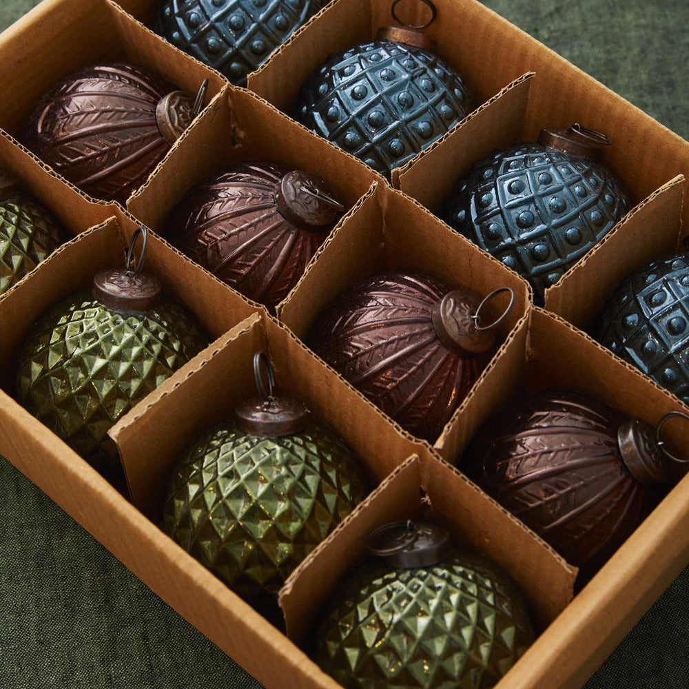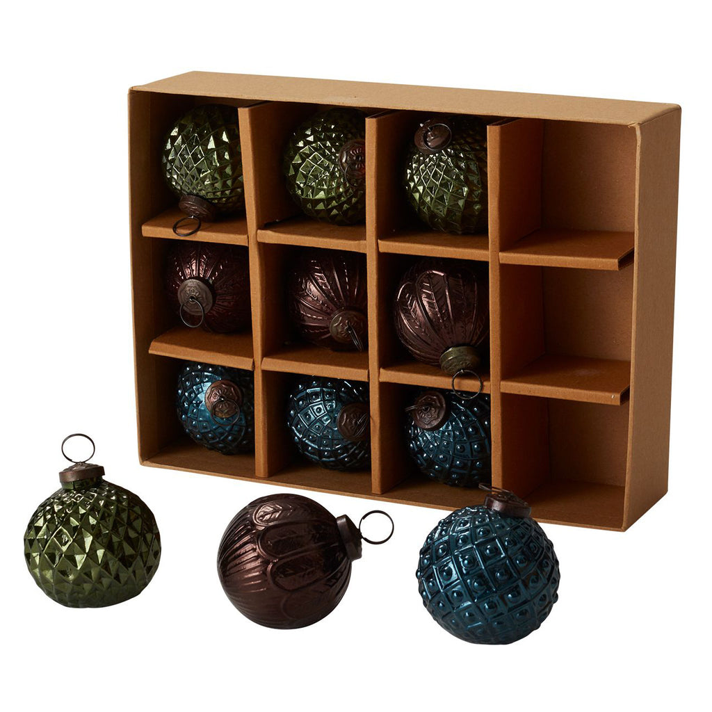 The Angelica Ornament Set is an opulent set of glass Christmas ornaments in three holiday hues. Rich metallic green, dramatic burgundy, and peacock blue look stunning when hung around a lit Christmas tree. A bronze metal cap tops each glass ornament and has a loop for an ornament hook.