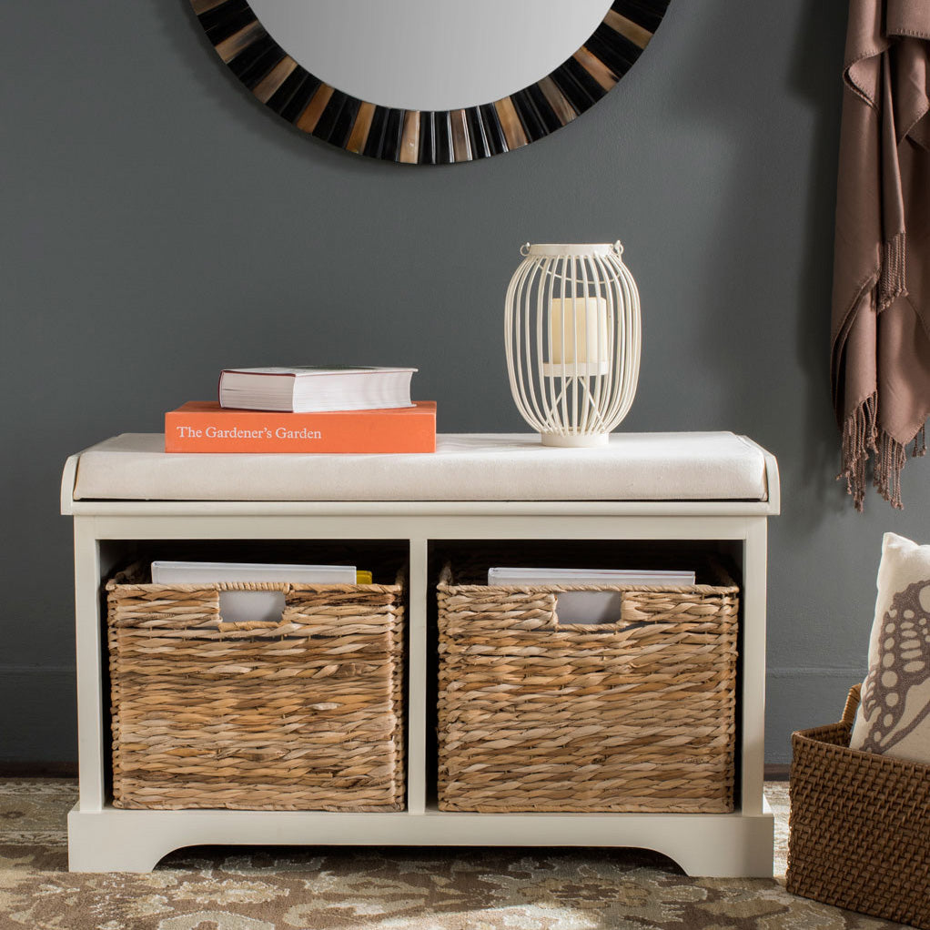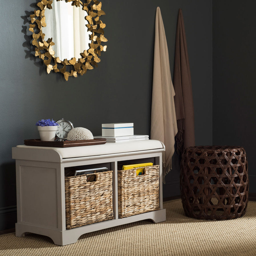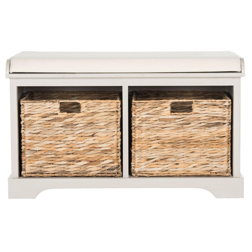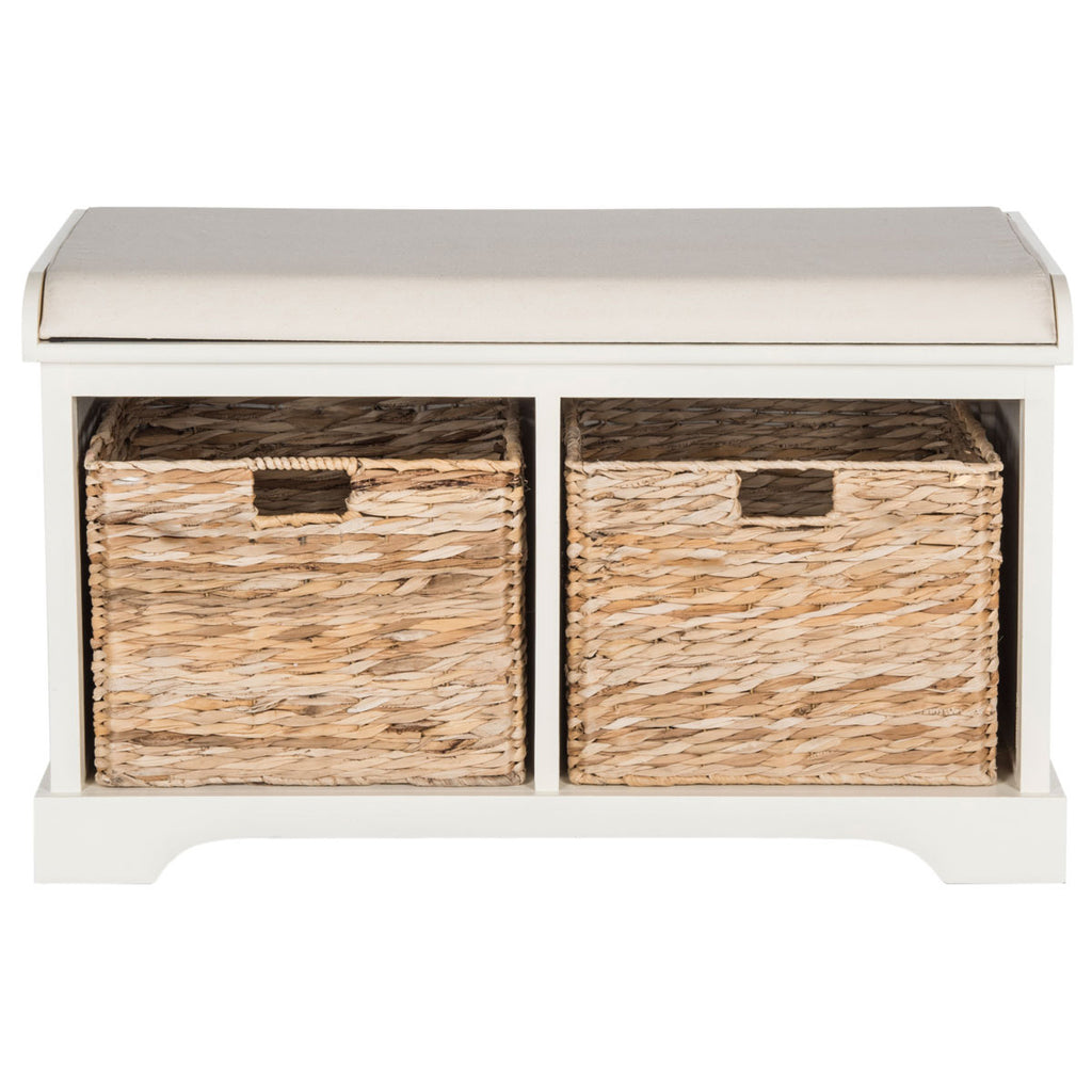 Sit back and relax. This pretty storage bench with dark brown pine frame and linen upholstered seat is perfect for changing shoes in entry hall, and its woven baskets can hold towels and other necessities in a master bath. A versatile piece in any room.