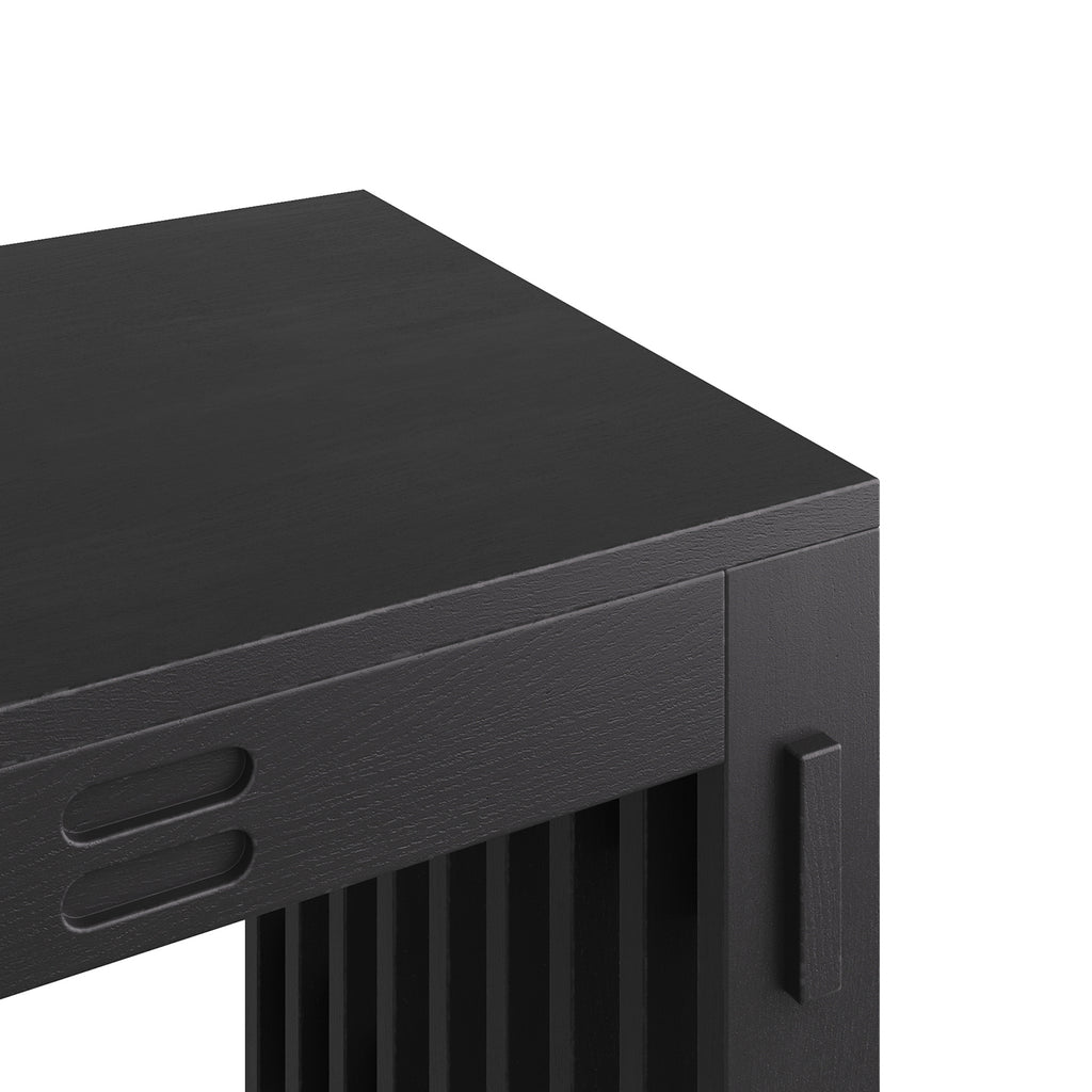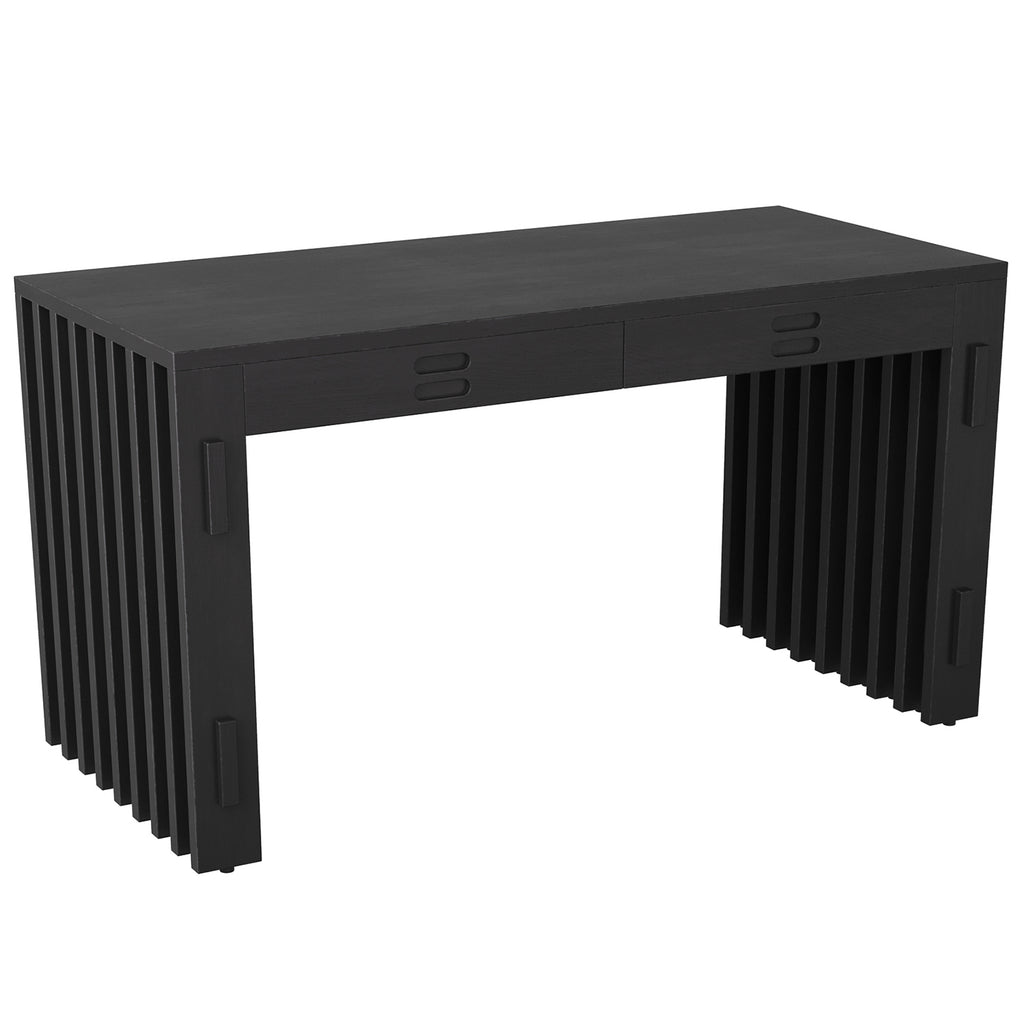 The minimalist aesthetic of japanese design informs our Arteriors Abraham Desk. Clad in quarter cut white cedar veneer in a bramble tone, the structure was created to float within any room. Supporting the desktop on either end is series of vertical panels that create an open screen effect, providing a rich feel and light profile.