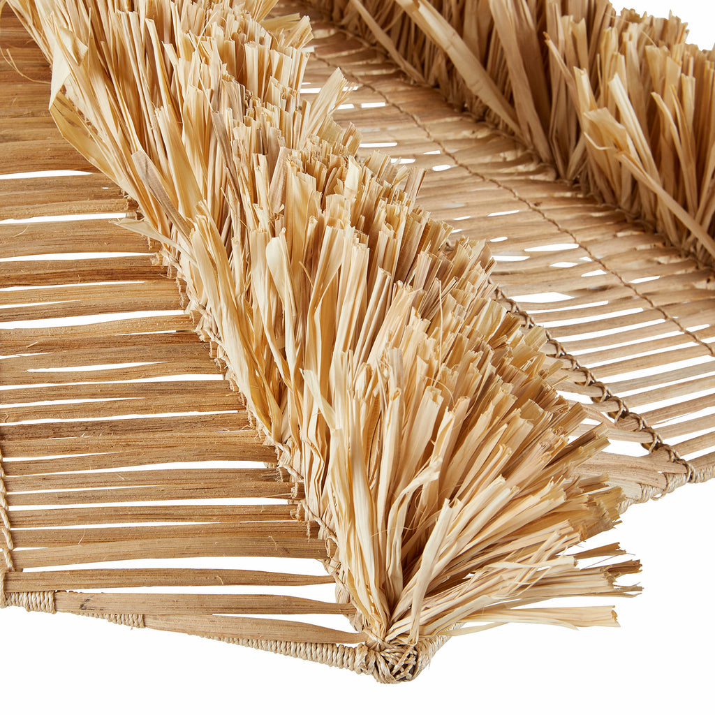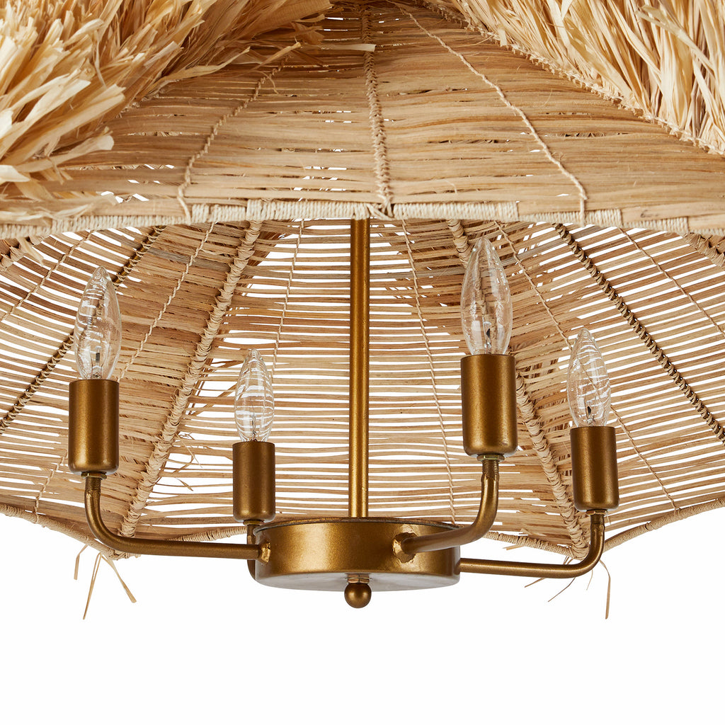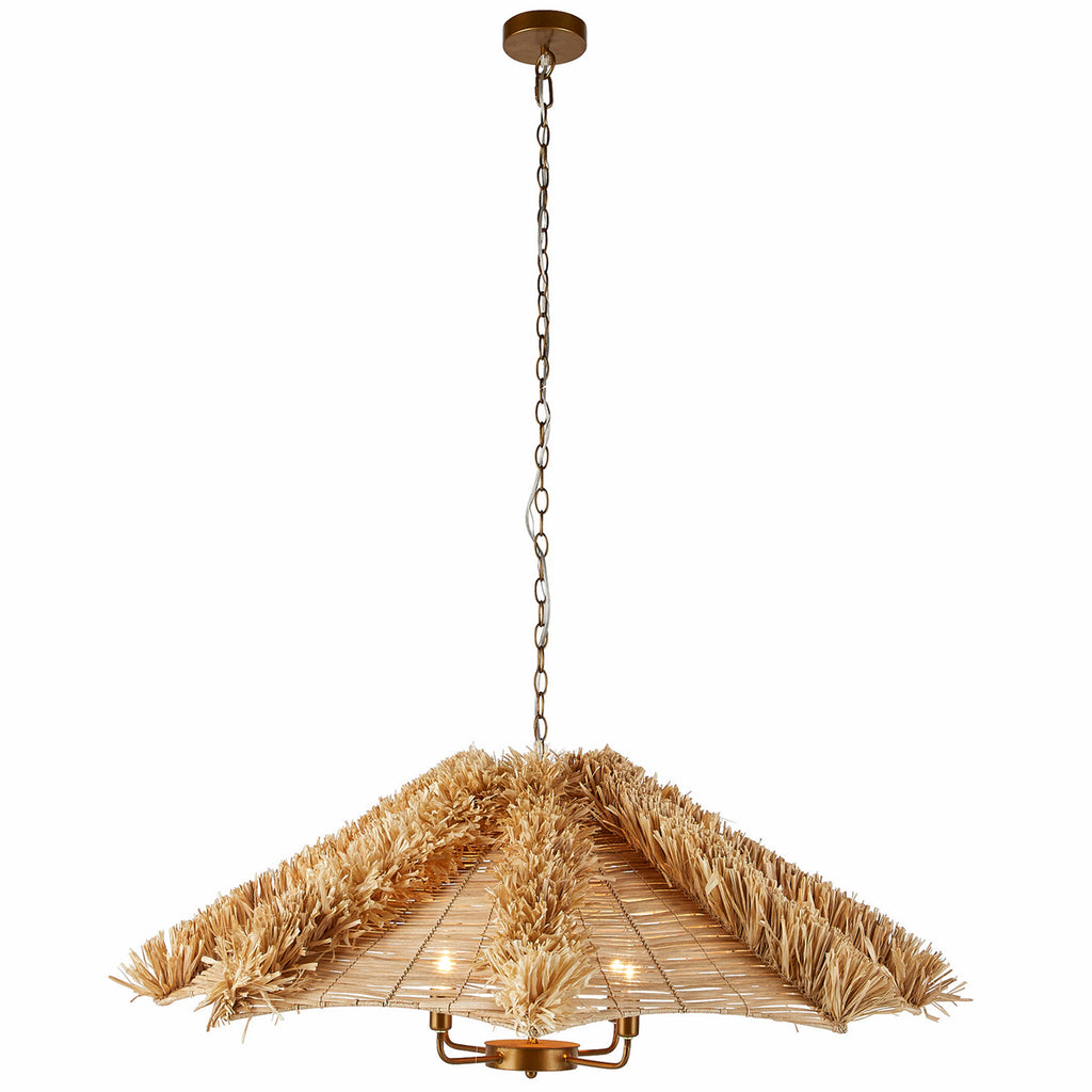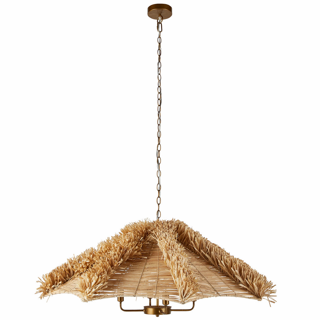 The woven palapa-style umbrellas of the yucatan peninsula inform our thatched fixture of natural raffia and rattan. This umbrella-style chandelier is fringed with a flourish, then suspended from an antique brass-plated chain and canopy. The resulting patterns of light will add a textural, playful pattern on the ceiling and walls. Finish will vary.