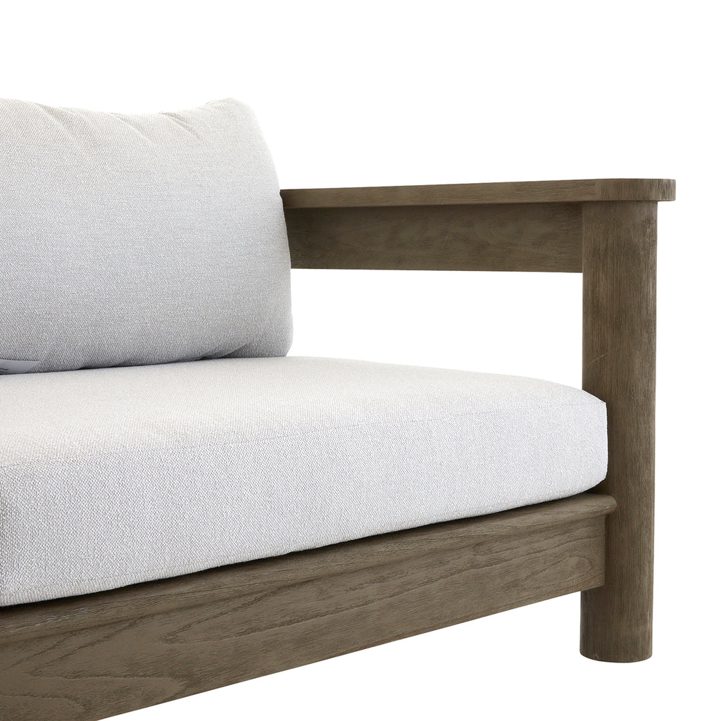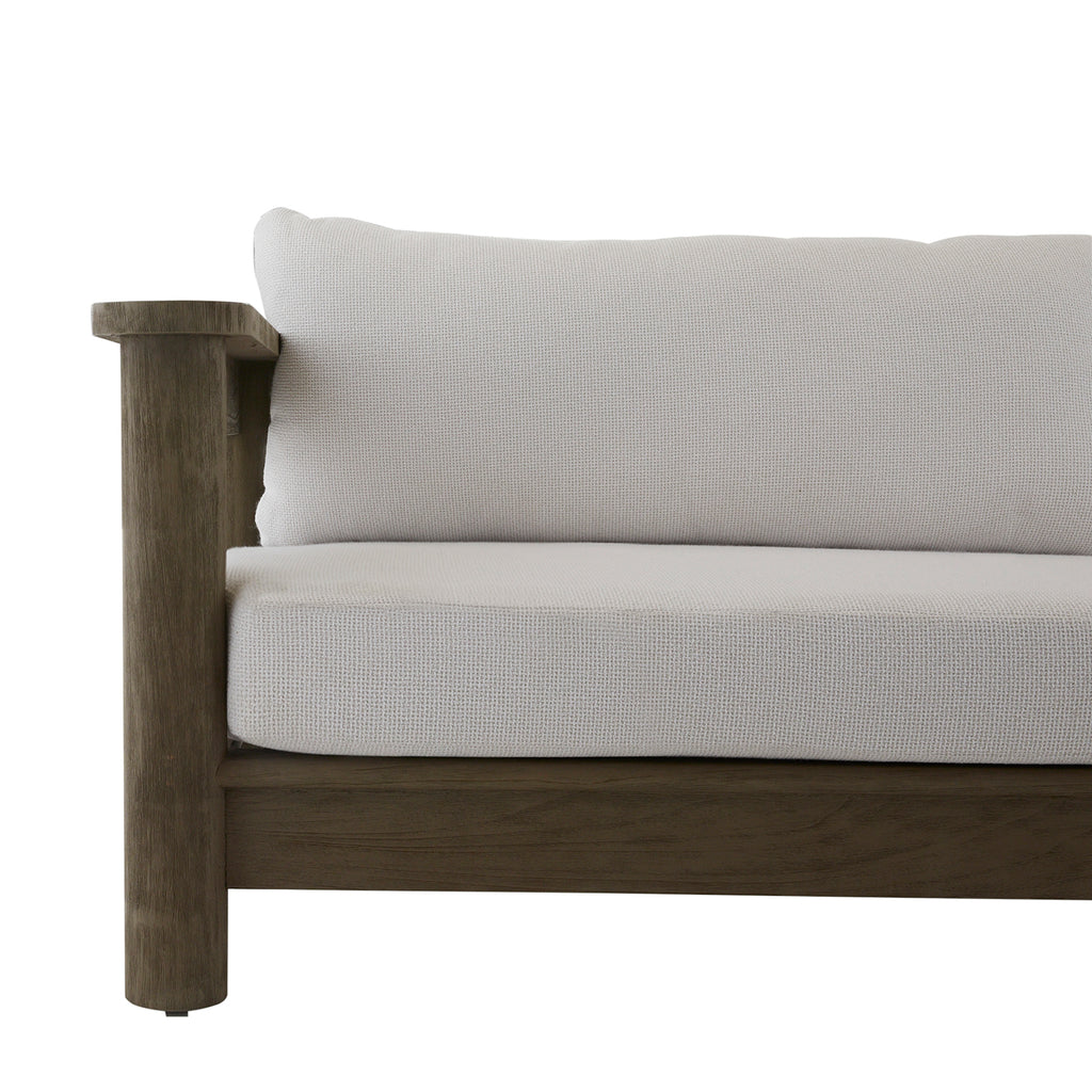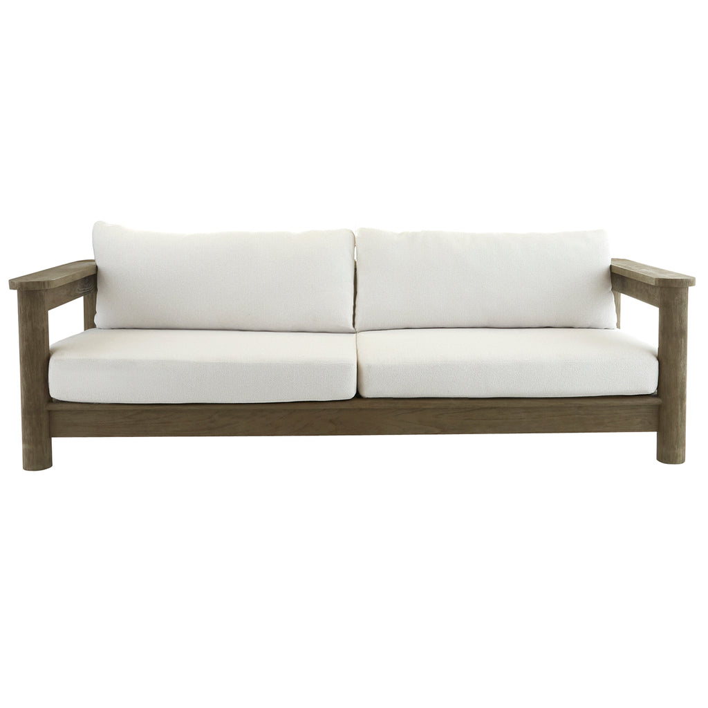 A comfortable companion to our Arteriors Caldwell ottoman, this long-lined sofa delivers a distinct 1970s influence. Constructed of teak wood in a rustic weathered texture, it is finished with carved dowel legs and our porpoise outdoor performance bouclé cushion. Finish will vary.