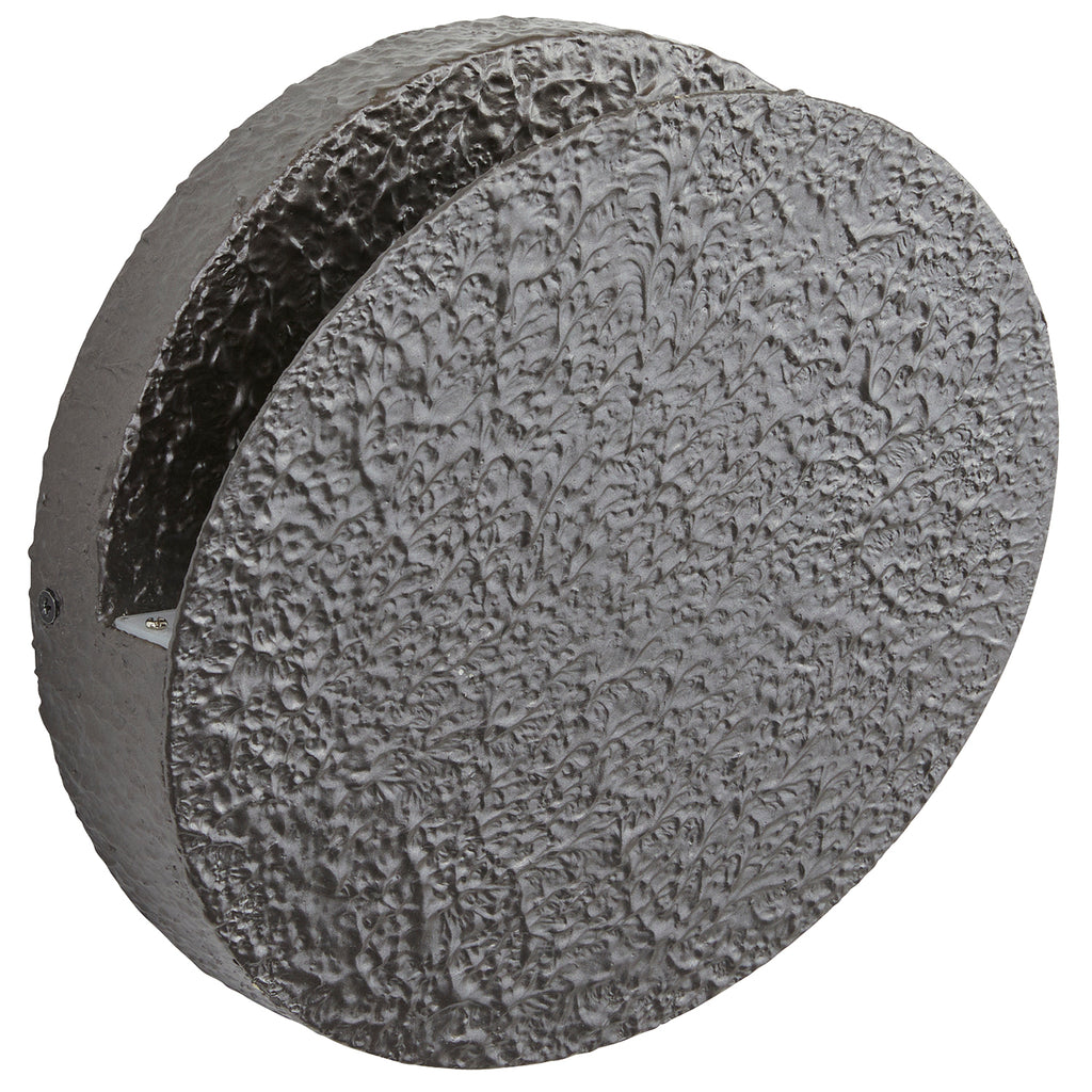 The perfect punctuation mark against a natural or dark wall, a circular sconce is a textural delight. Forged of aged iron, the off-black metallic finish has a paint-like daubed finish. Bisected by an opal glass sliver, this minimalist style is not suitable for use in coastal or marine environments. Finish will vary.