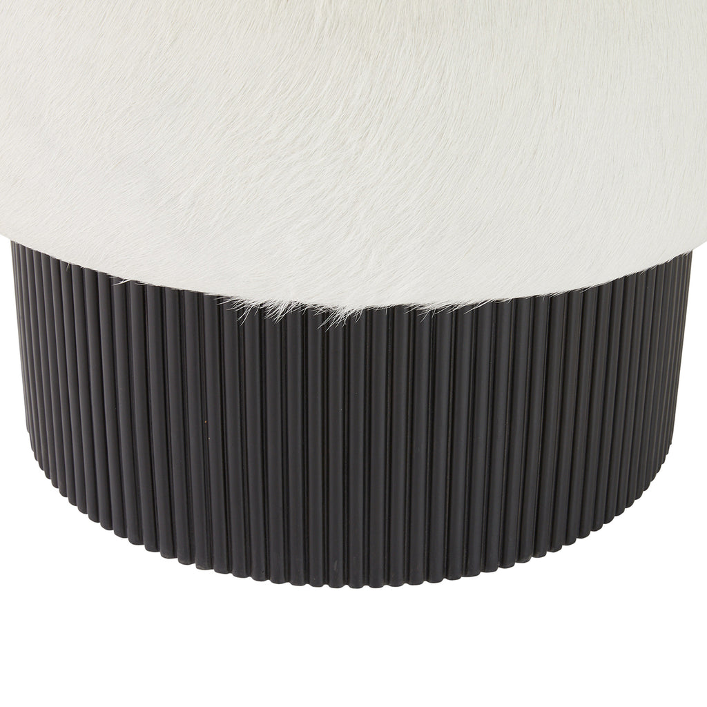A traditional swivel chair is enhanced with a tubular bolster back for a playful—yet comfortable—edge. Designed in soft white hair-on-hide, it features textural reeded beech wood details of deepest ebony to deliver much-needed visual contrast. Round textural base. Hide will vary.