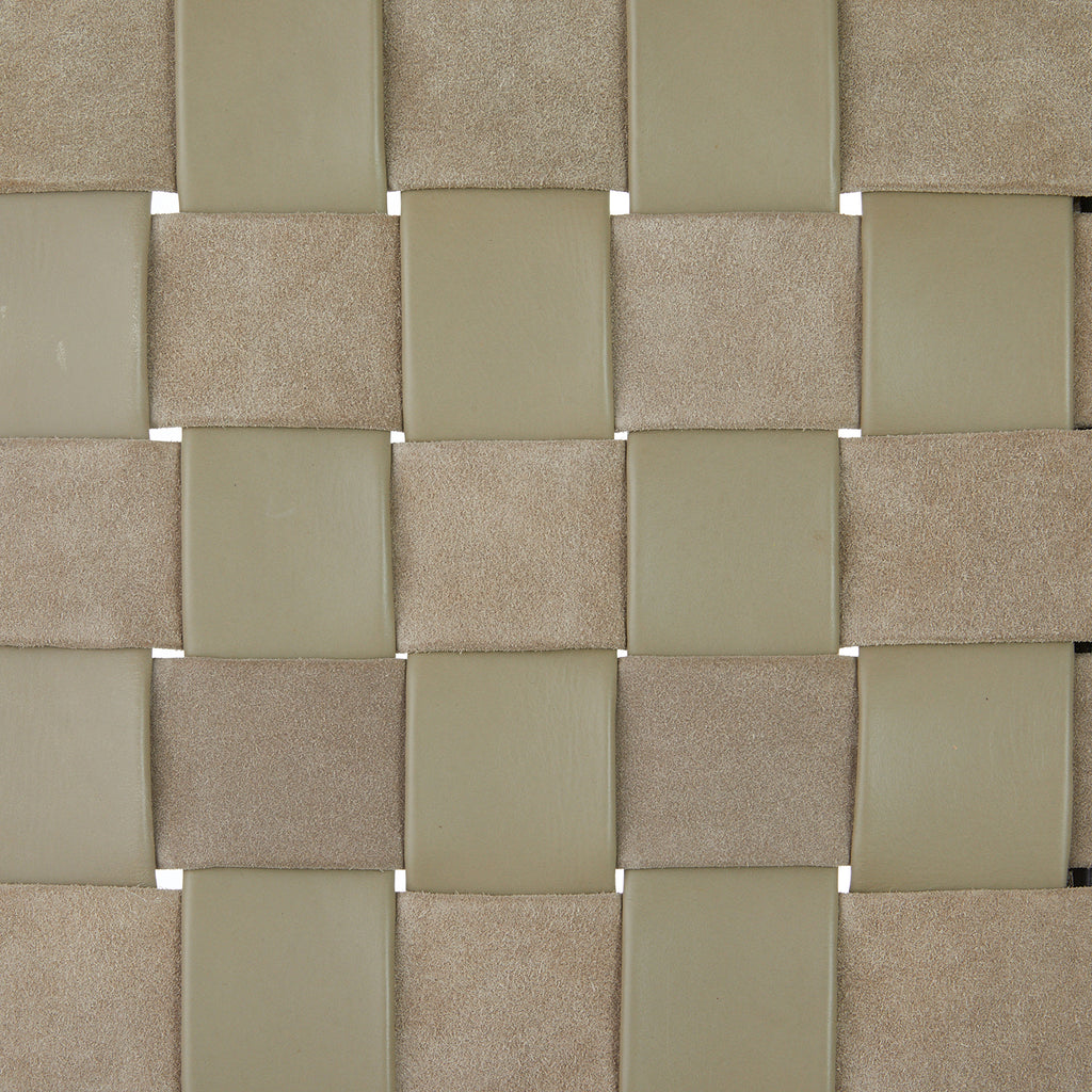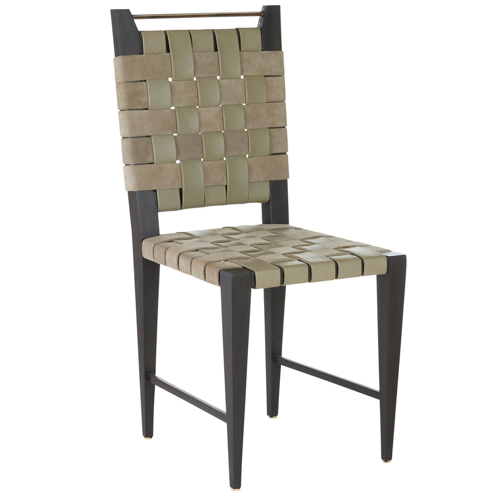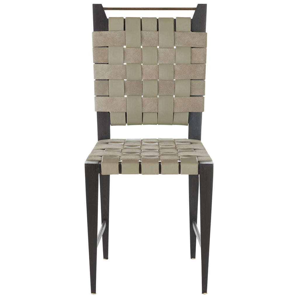The Arteriors Lakewood Dining Chair was designed to add textural impact. Both tactile and comfortable, its muscular frame of ebony beech wood is juxtaposed with the overscaled woven back and seat of interwoven suede and leather in a soft stone hue. An antique brass crossbar at the top allows for easy portability about the room. Finish will vary.