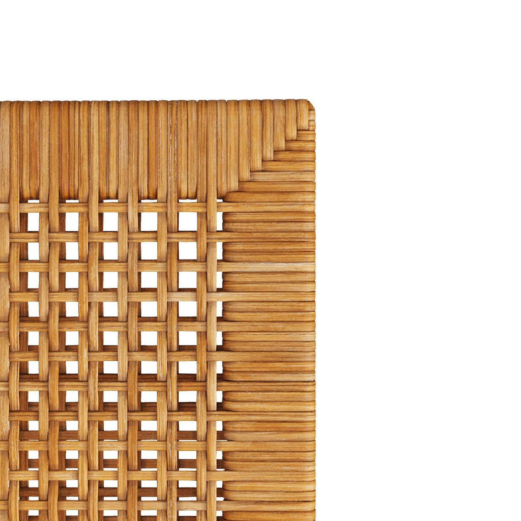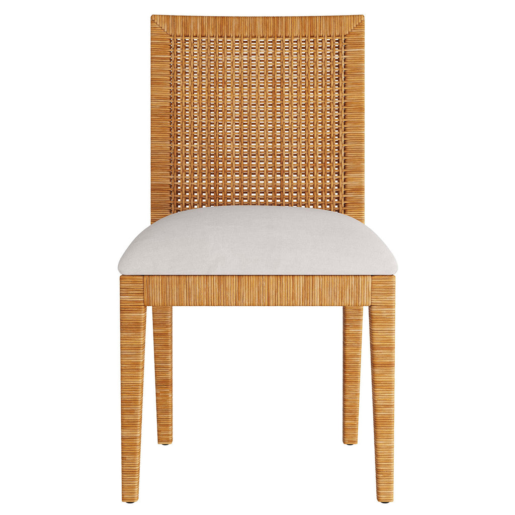 The Arteriors Palmer expresses a relaxed yet refined aesthetic that marries modern lines with the rich appeal of rattan. The striking side chair is designed with natural rattan that wraps the chair’s mahogany frame and forms the caning on the arm panels and back rest. The seat is upholstered in breezy, bright white muslin for recovering. Finishes will vary.
