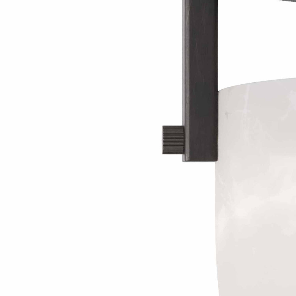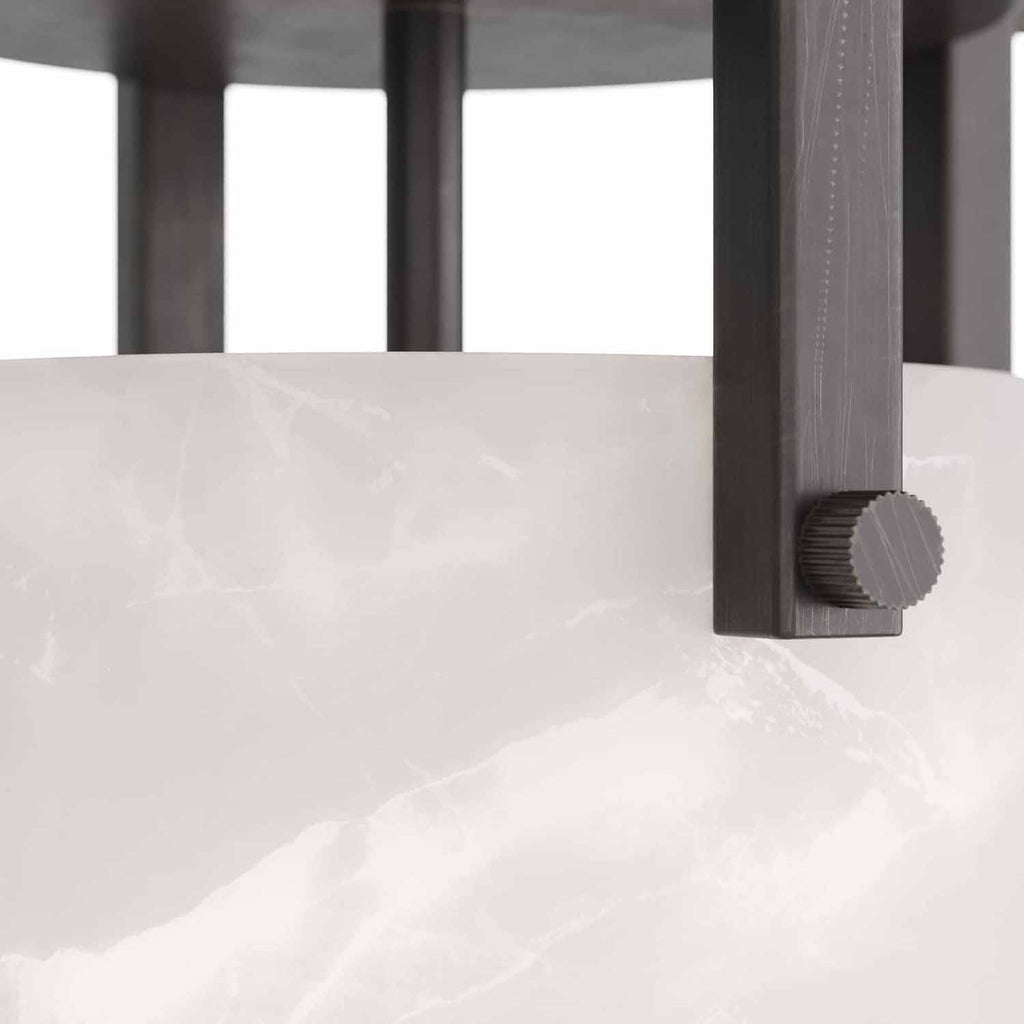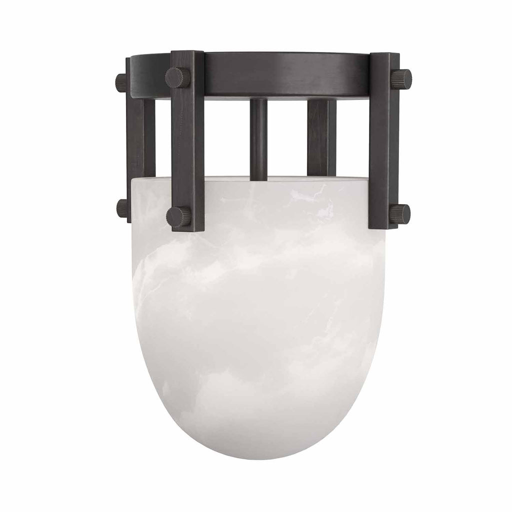 An elegant and statement-making solution for small spaces, the toren flush mount is brilliantly crafted in a domed, white alabaster shade suspended from a brawny frame of english bronze ironwork. Finish will vary. Damp-rated, although limited covered outdoor conditions may affect finish.