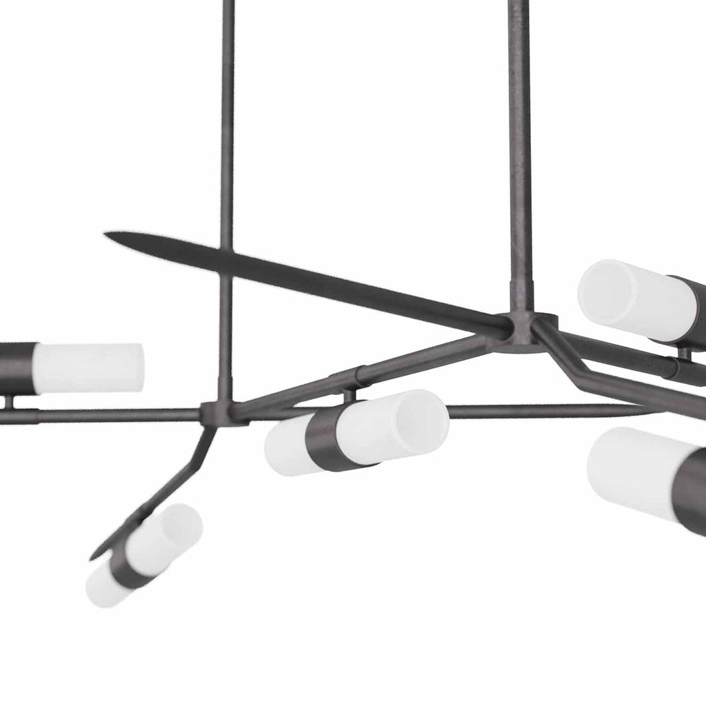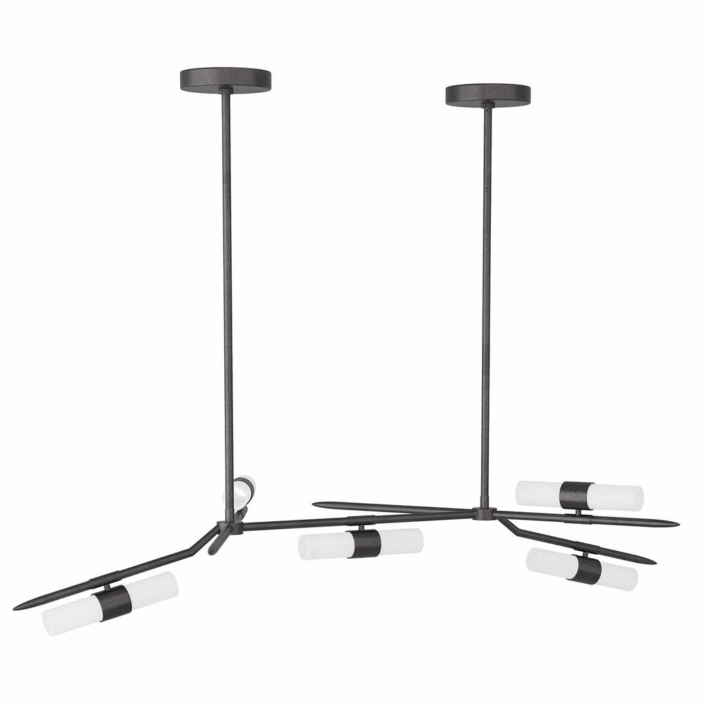 Arteriors Home lighting embodies the perfect balance of form and function, creating an ambiance that is both captivating and inviting. With an emphasis on superior craftsmanship, Arteriors ensures that their chandeliers not only illuminate the room but also make a statement. Conceived in angular, brutalist-style forms, the Arteriors Travis chandelier is forged in a framework of english bronze iron and features barbed branches that secure cylindrical white alabaster shades. The linear composition is fitted with a dual pipe suspension and canopies, also in english bronze iron. Finish will vary. Damp-rated, although limited covered outdoor conditions may affect finish.