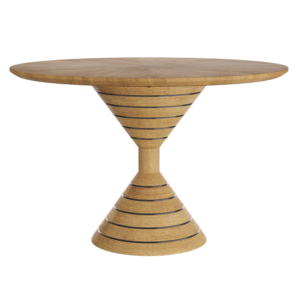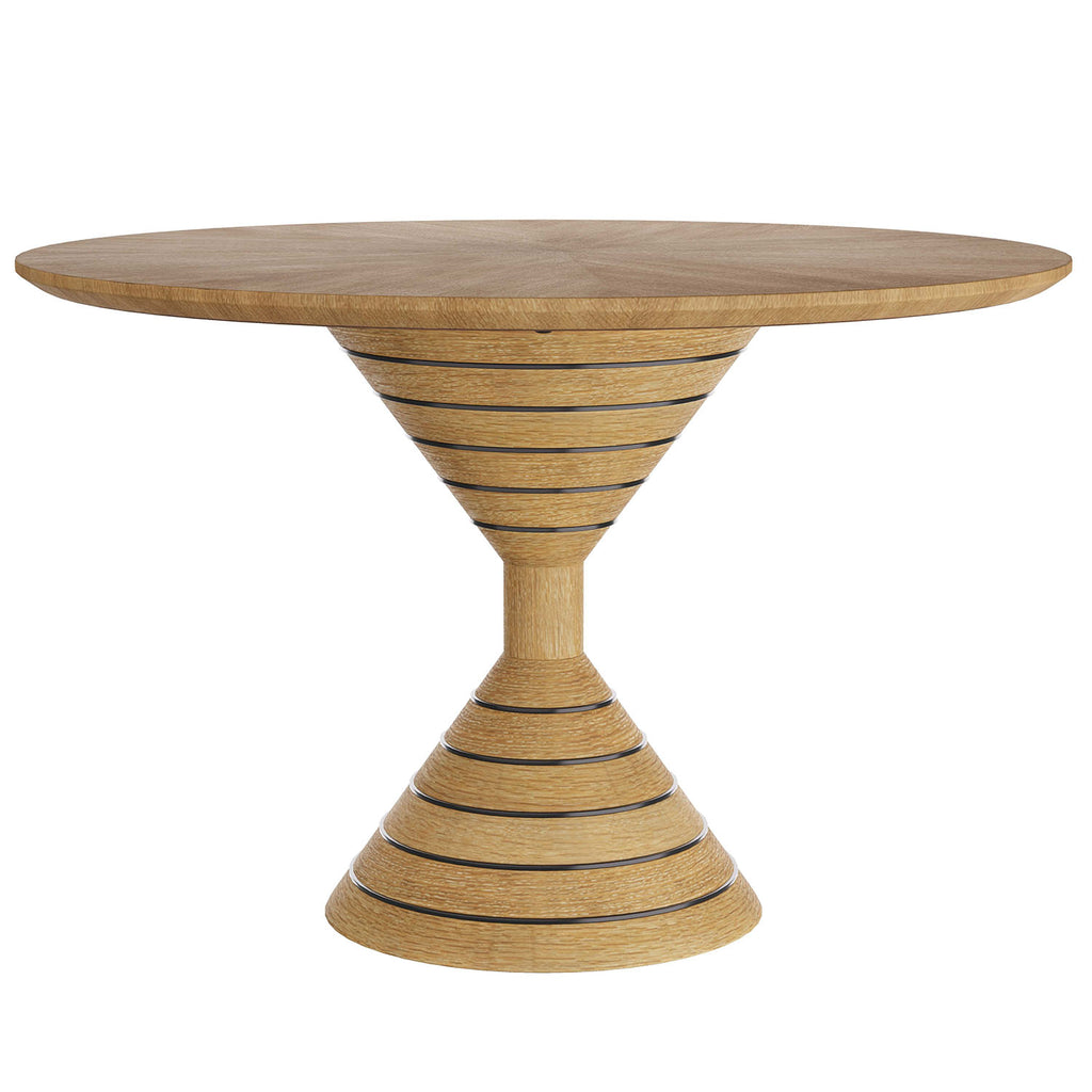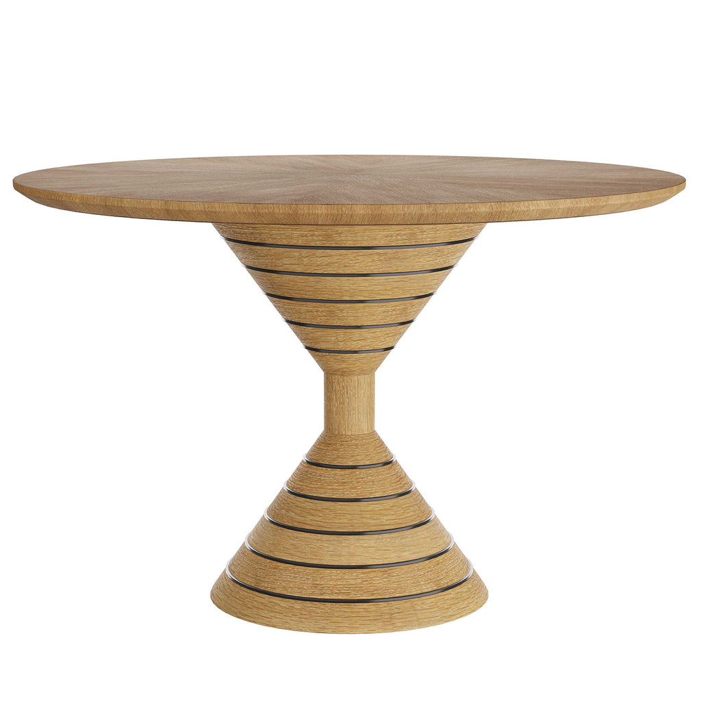 The Arteriors Wilken table makes a striking first impression. Scaled as an ideal proportion in an entry, the round table is also a stylish choice for a dining space. Designed in a sculptural hourglass silhouette, the oyster oak veneer table is lavished with bronzed brass inlays that form concentric rings around the pedestal base. Finish will vary.