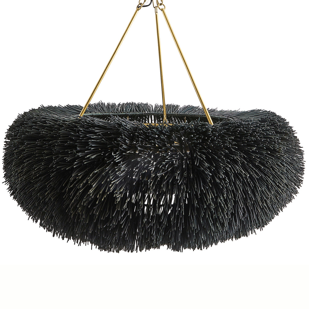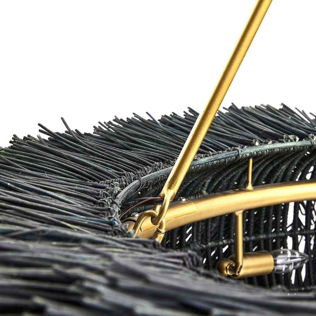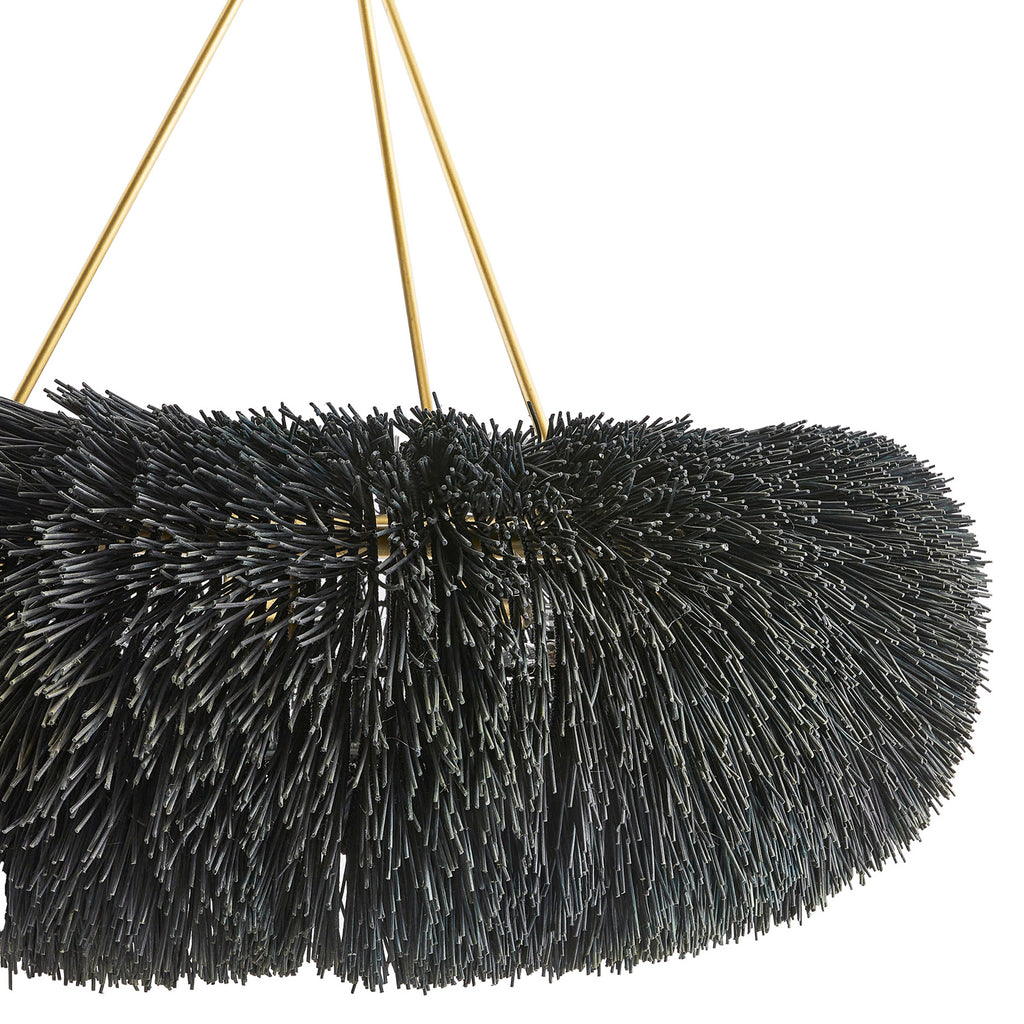 A play of shadow and light peeks through woven rattan in a classic ring silhouette. Stained in black and suspended from a trio of antique finished pipes and chain, Arteriors Zaria Chandelier was made to reflect intriguing shadows on walls and ceiling through the open weave of sustainable rattan. Finish will vary.