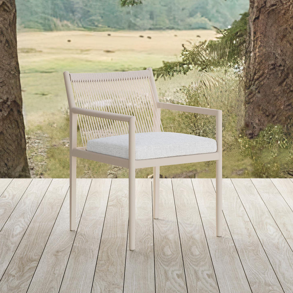 The Madeira Dining Chair from Azzurro Living excites audiences with linear, breezy weaves of all-weather textelene rope, rigorously formulated to resist harsh weather and commercial spaces. An alluring, tubular frame is formed, welded, and polished by hand using lightweight, durable aluminum. The varied thickness and subtle differences of form creates a cohesive, yet mesmerizing composition from every angle. The tasteful simplicity of intertwining textelene rope captivates with a linear system of support and backing, offering reliable and lasting comfort. High density cushions, wrapped in delicately soft solution dyed acrylic Solvita Performance Fabric, caters deep-down comfort and combats severe conditions. Hassle-free materials allow you to sit back and rest easy in the sophisticated, mid-century modern Madeira Dining Chair.