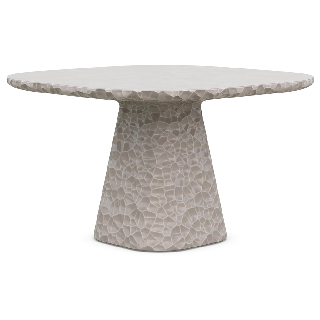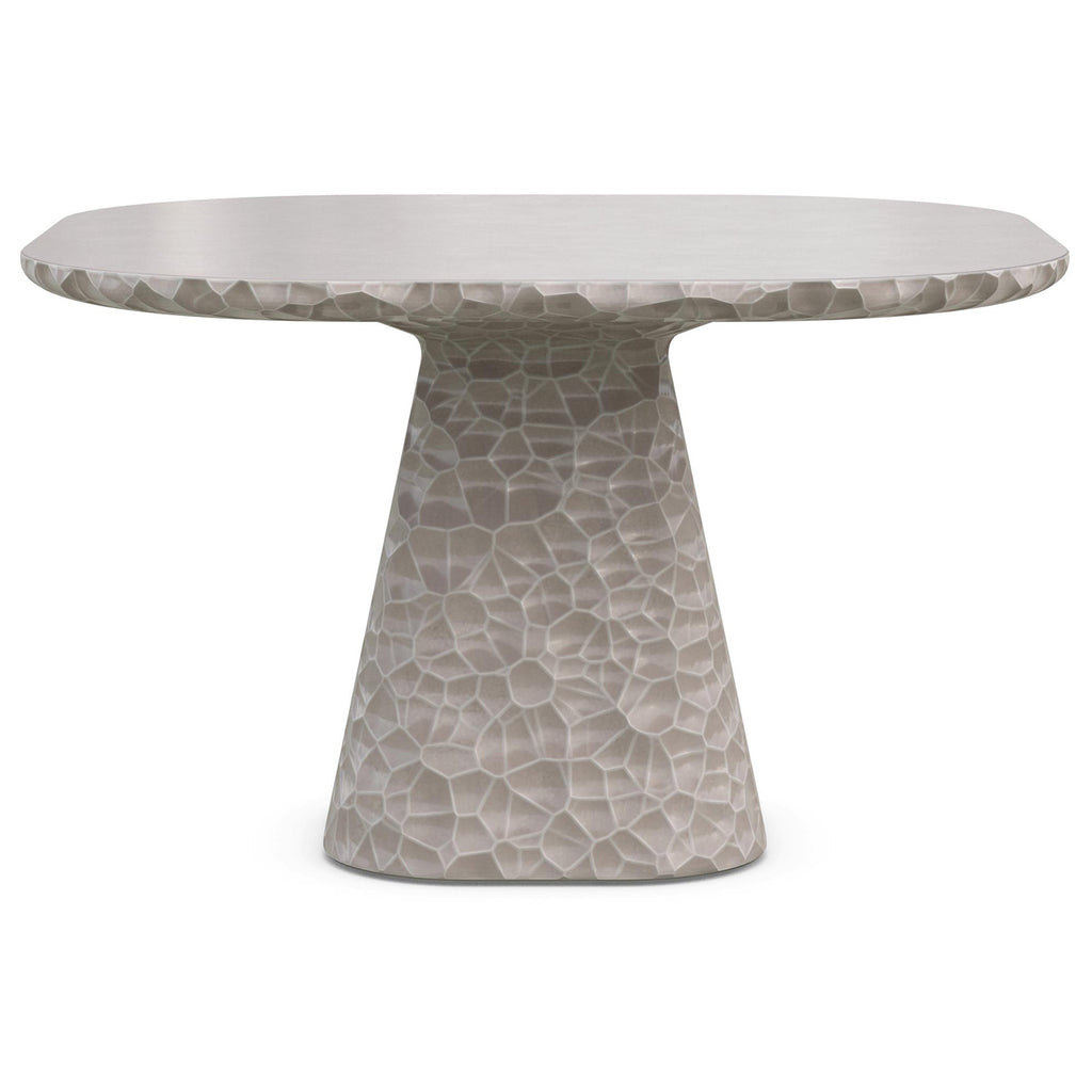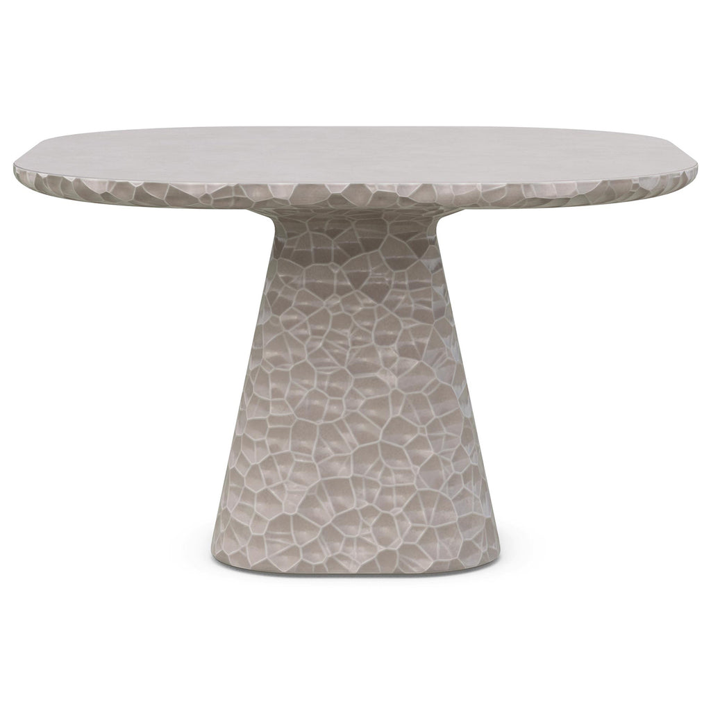 Elegantly crafted, the Panama Dining Table from Azzurro Living combines old-world charm with modern sophistication. Hand-carved circular details and a sleek polished table top create a captivating look. Its abstract honeycomb texture, resembling hammered metal, is reimagined in glass fiber reinforced concrete, providing durability and resistance to the elements. Choose the Panama Dining Table for enduring elegance.