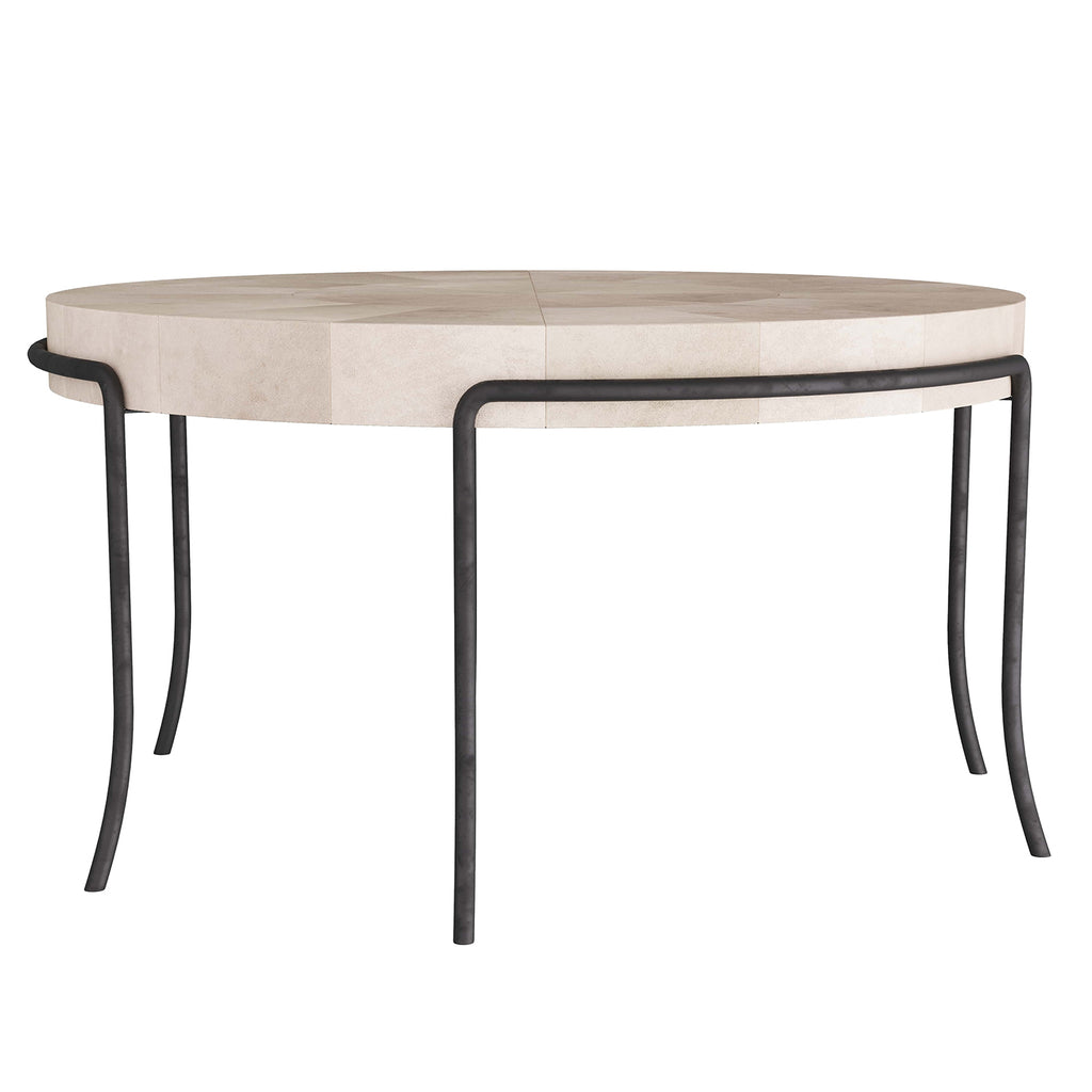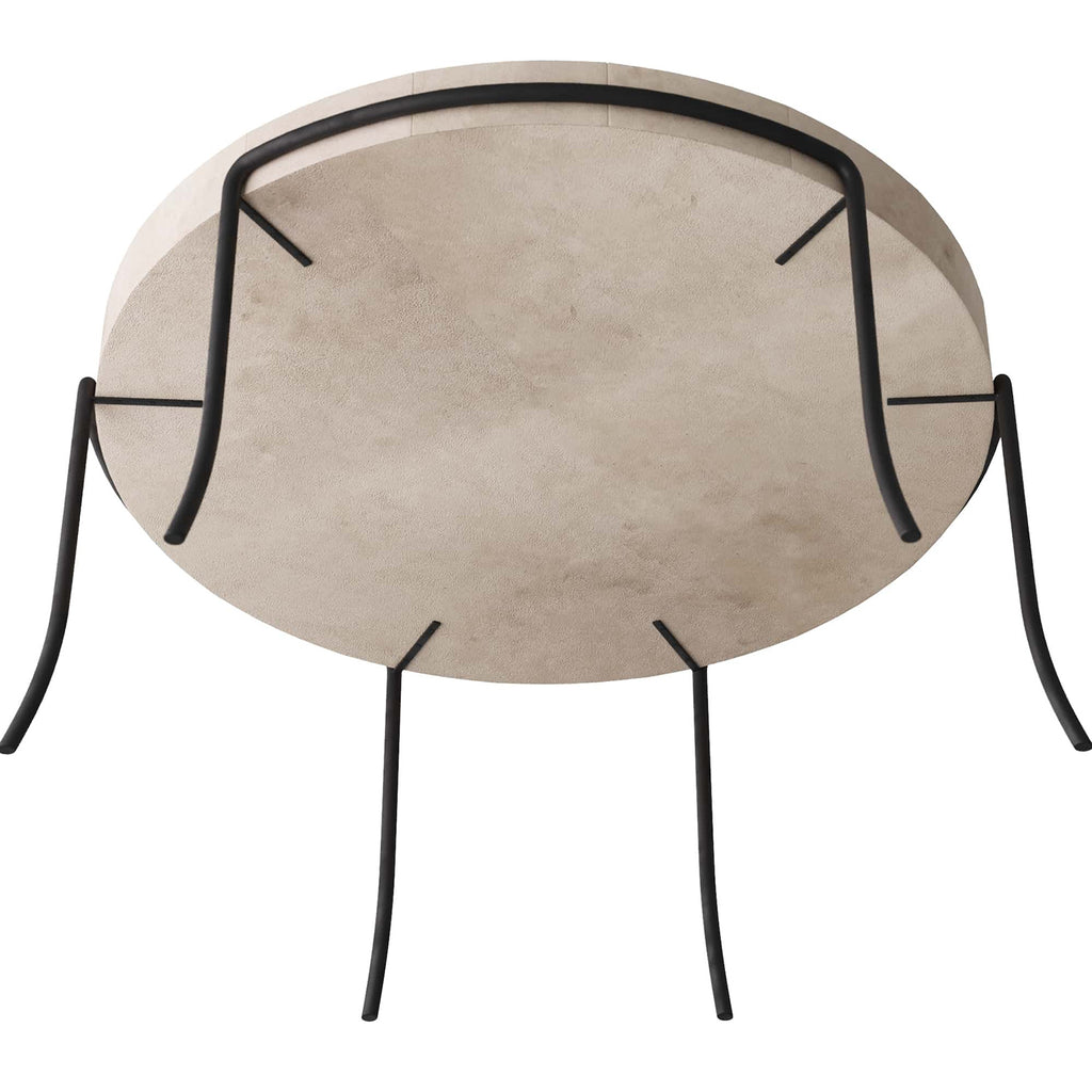 Harkening to the graceful curve of a mosquito's leg and the klismos silhouette of ancient greece, this table is an instant classic. The ivory vellum surface lends luxe texture to any room in the house. The blackened iron legs add contrast to the top. Finish will vary.