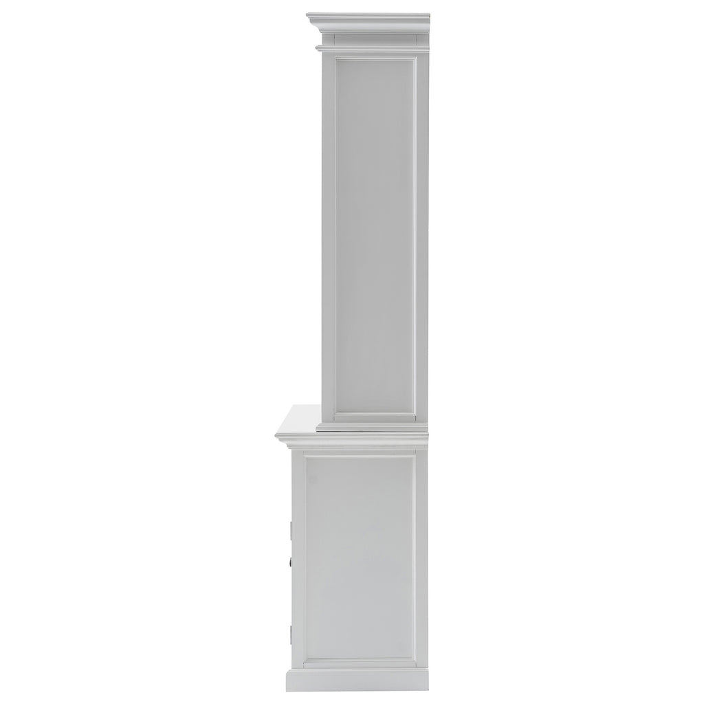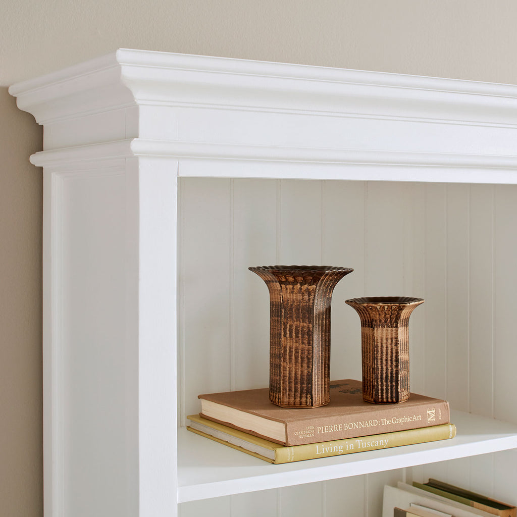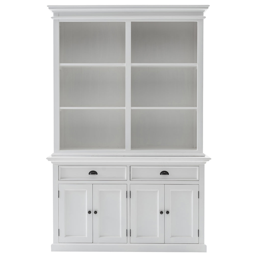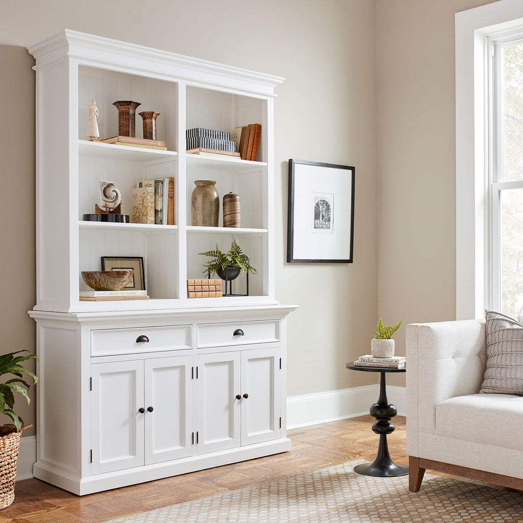 Beckton combines the quaint charm of the French Countryside with the coastal flair of the Eastern Seaboard to form a comprehensive range befitting the dining area, living space or bedroom. Detailed profiling on each piece, together with the warm finishing and antique brass hardware, provides a classic collection for the contemporary home. This generously proportioned and versatile hutch unit can find its home in your living room or bedroom. Two separate components working together to create ideal storage. The base unit, with its combination of drawers and deep shelving, can be home to personal items or linens. The upper shelving unit features detailed beadboard wainscotting, that acts as an attractive backdrop for books or collectibles.