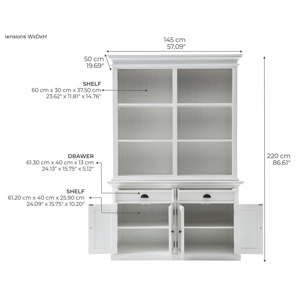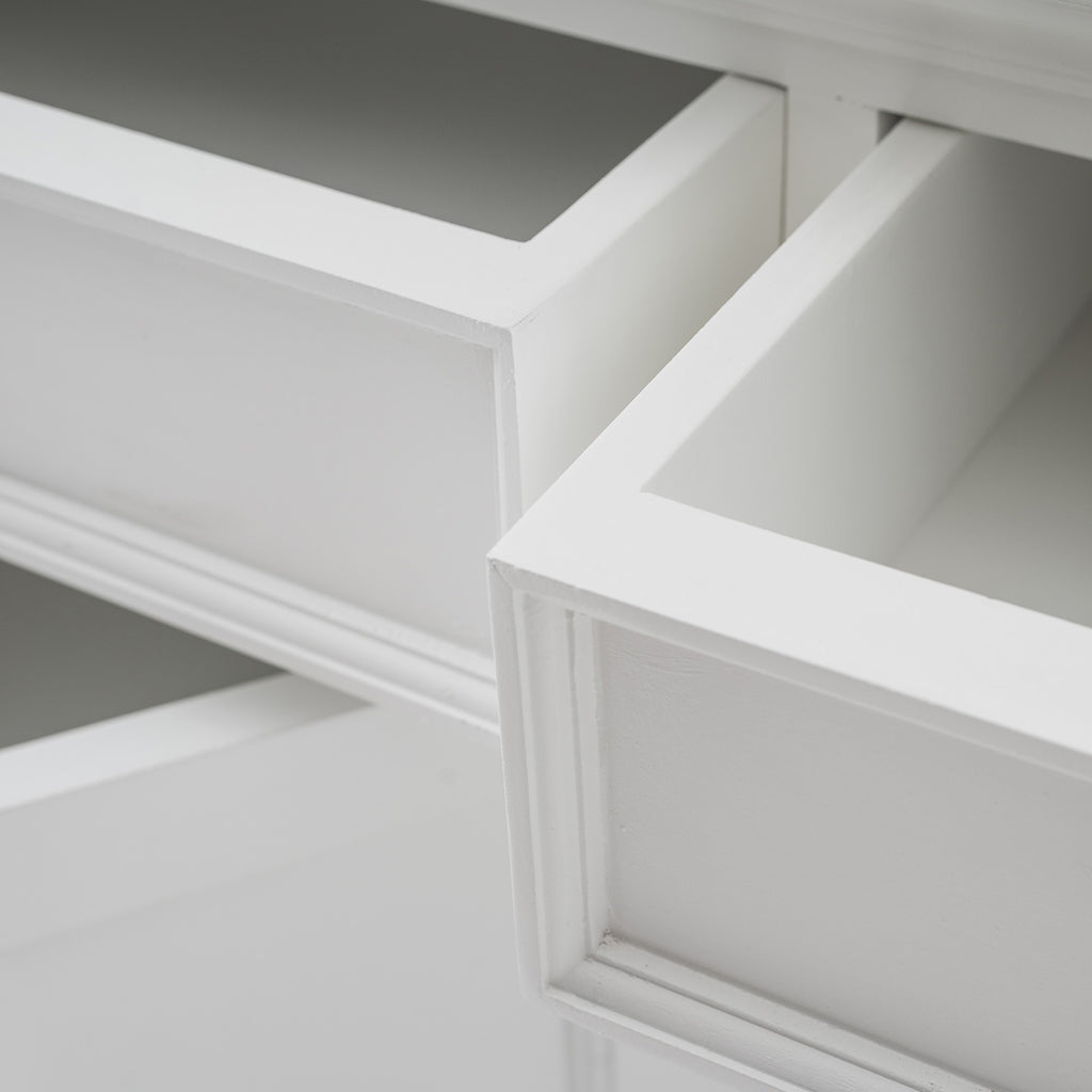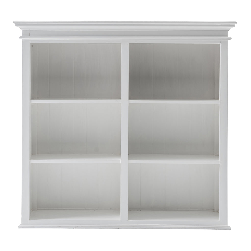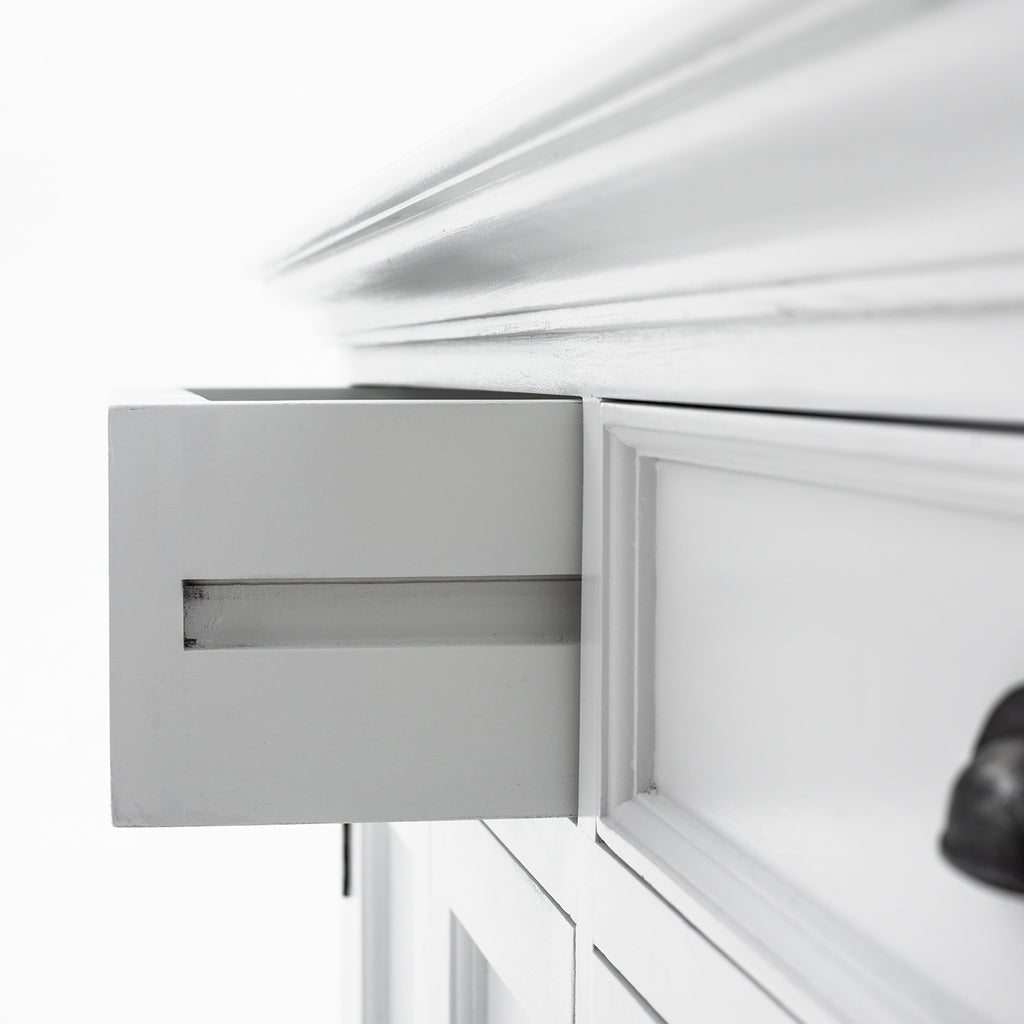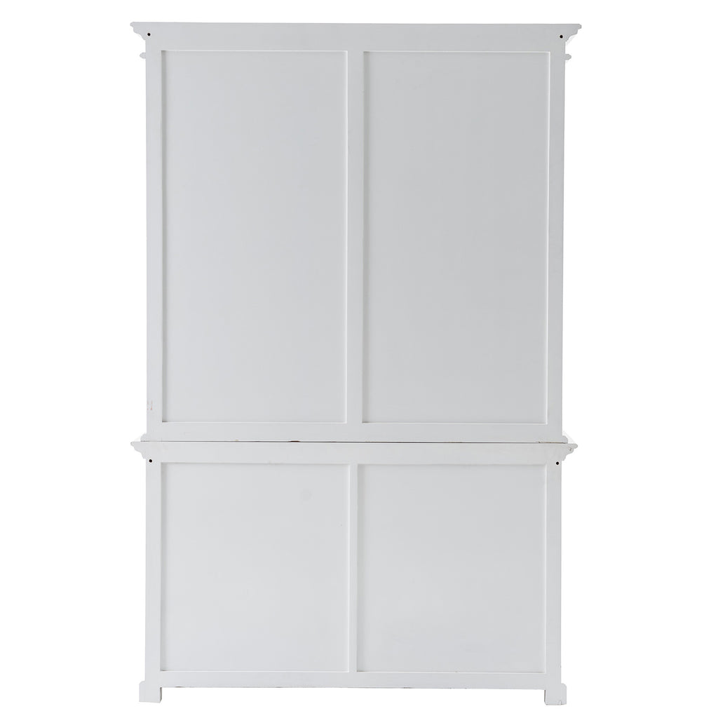 Beckton combines the quaint charm of the French Countryside with the coastal flair of the Eastern Seaboard to form a comprehensive range befitting the dining area, living space or bedroom. Detailed profiling on each piece, together with the warm finishing and antique brass hardware, provides a classic collection for the contemporary home. This generously proportioned and versatile hutch unit can find its home in your living room or bedroom. Two separate components working together to create ideal storage. The base unit, with its combination of drawers and deep shelving, can be home to personal items or linens. The upper shelving unit features detailed beadboard wainscotting, that acts as an attractive backdrop for books or collectibles.