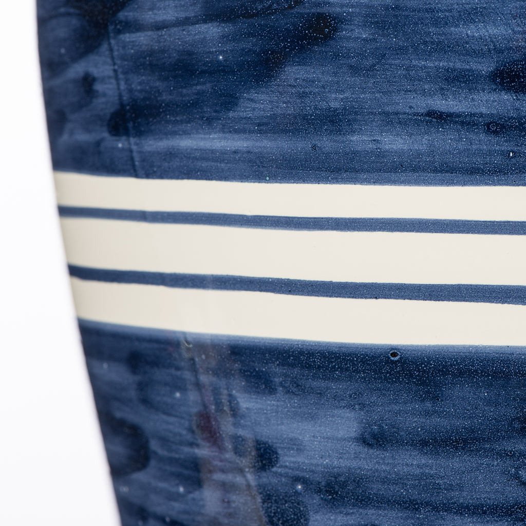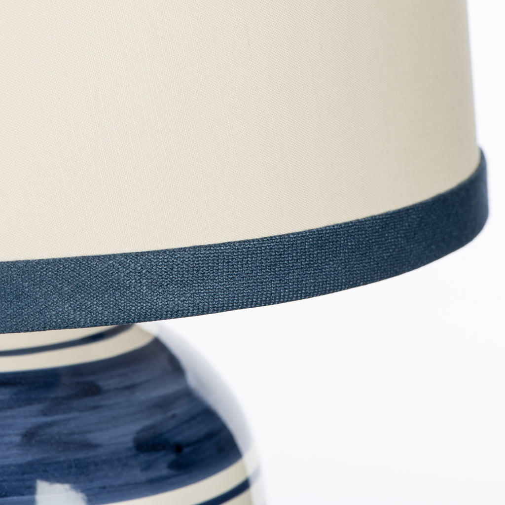 Put the last touches on a nautical bedroom or living area with this coastal ceramic table lamp. Navy blue striping is hand-painted and creates a posh, polished look while maintaining a striking, casual ambiance. A lovely egg linen shade features navy trim across its top and bottom.