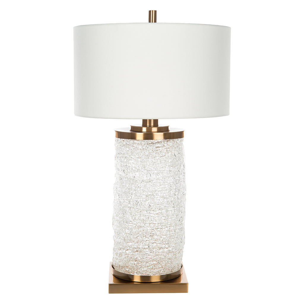 Sugar glass shakes up the silhouette of this streamlined column table lamp; Boasting a beautiful white and coffee bronze color motif. The drum style shade offers plenty of aesthetic appeal. The brillant coffee bronze finished metal accents below and above the unique glass colum is finished with a matching coffee bronze cylinder finial.