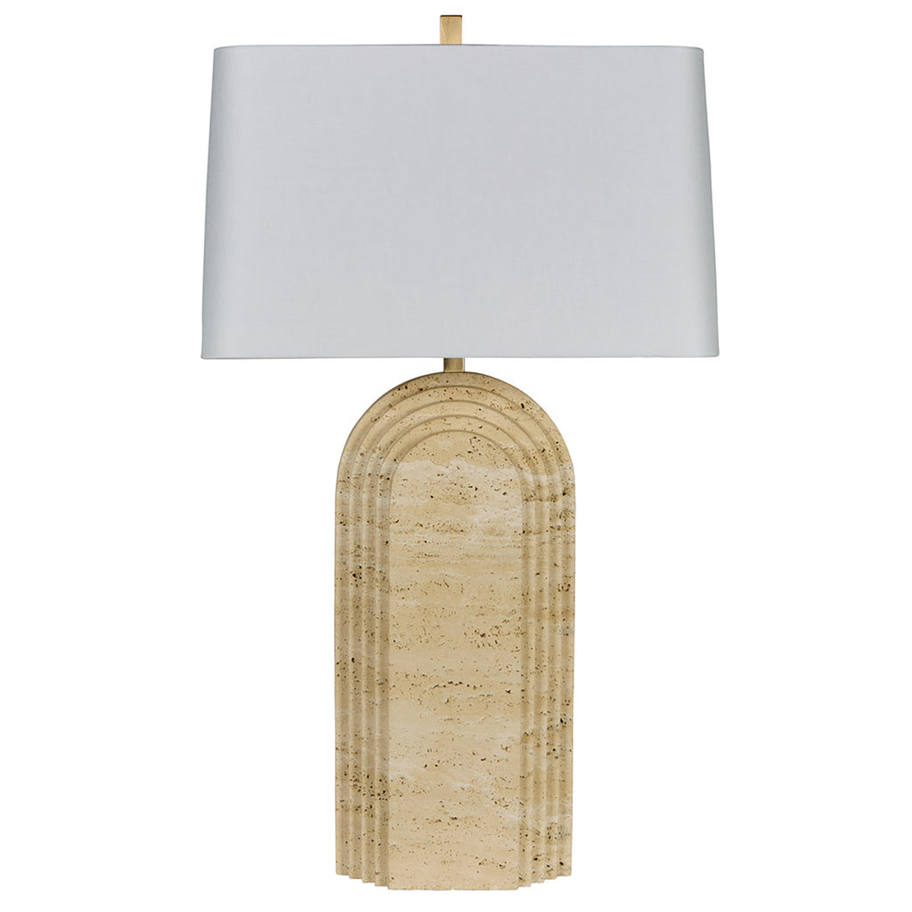 Layered arch details bring graceful energy and elegance to this modern stone table lamp. Beautiful on a side table or console, it offers a warm, natural coloration that complements myriad hues within surrounding decor. The graceful curves of its arched base are paired with a rectangular shade in a soft cream, delivering true, soft illumination.