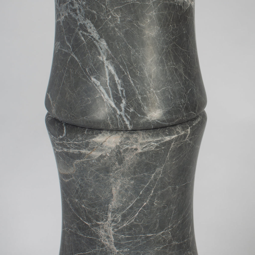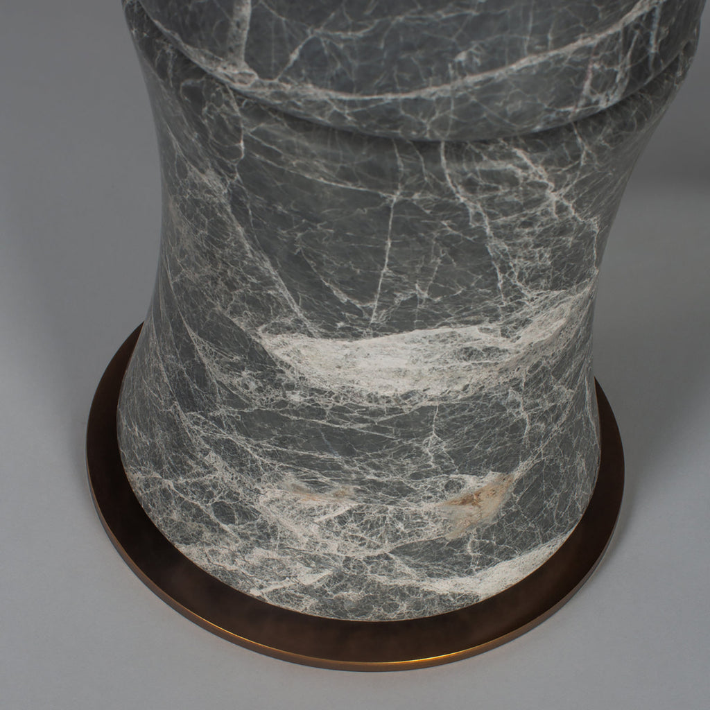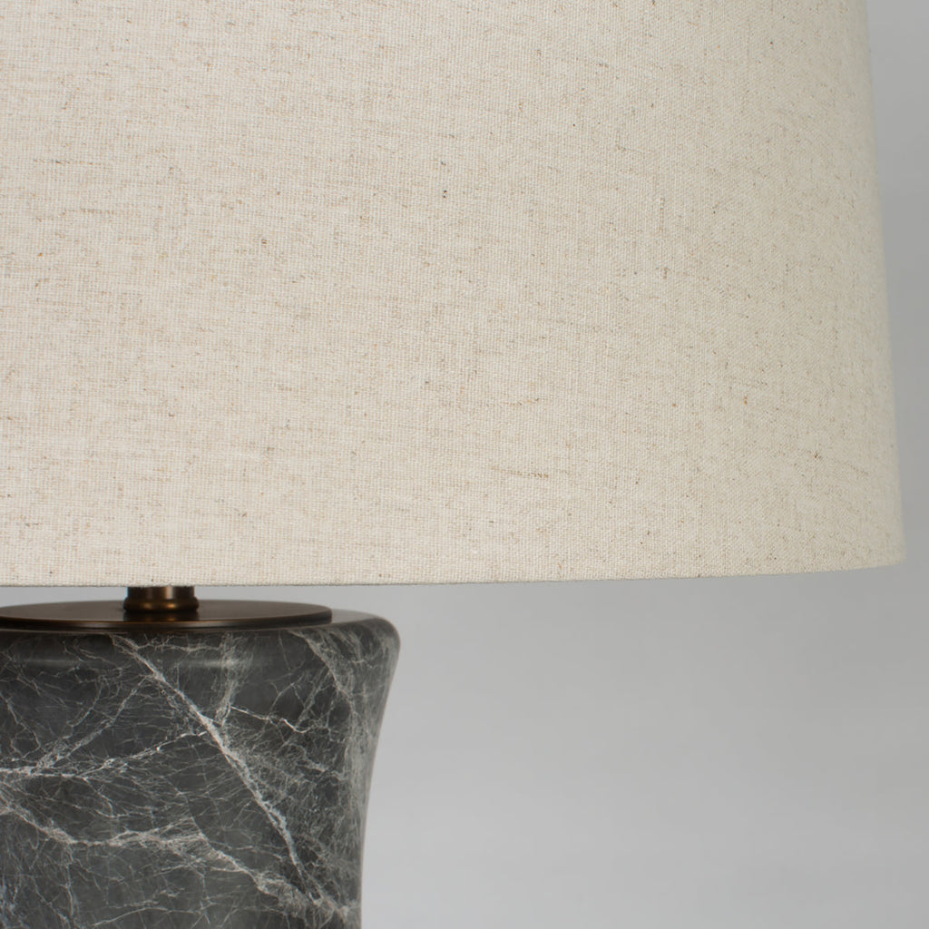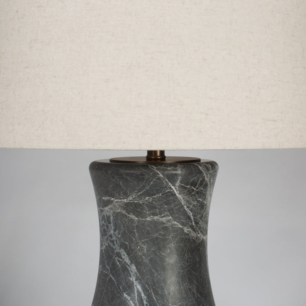 Bamboo-inspired segmenting creates a fresh, organic ambiance for this transitional marble table lamp. Its lovely gray and white coloration adds depth to the cool marble stone column, which adds gentle curves for an intriguing silhouette. On top, a cream cotton blend drum shade delivers soft but true illumination that's beautiful for both tasks and inviting ambiance.