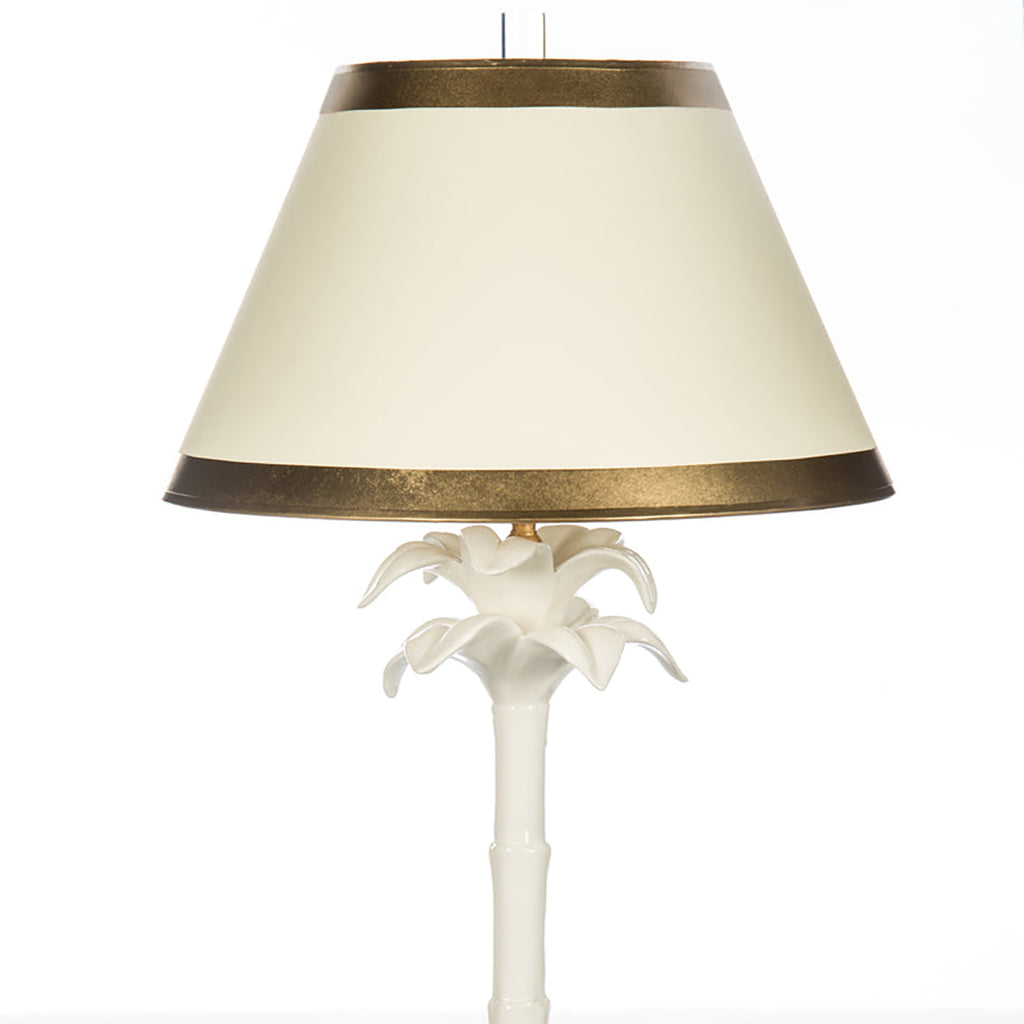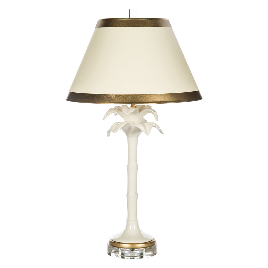 Build an oasis in a casual interior space with a lamp that reflects fun artistry and elegant style. This ceramic table lamp delivers tropical inspiration with a palm tree silhouette made from white finish ceramic. Warm gold leaf accents are coordinated from the base to the hand painted parchment shade.
