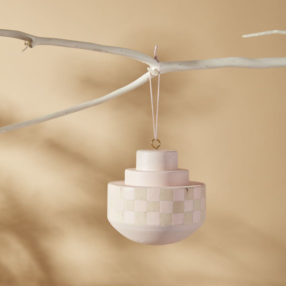 Add a natural, woodsy feel along with a trendy style to the Christmas tree or garland with the handmade Breda Ornament. Featuring a hand painted checkerboard pattern on pine wood, this bauble ornament is a modern take on a classic style.