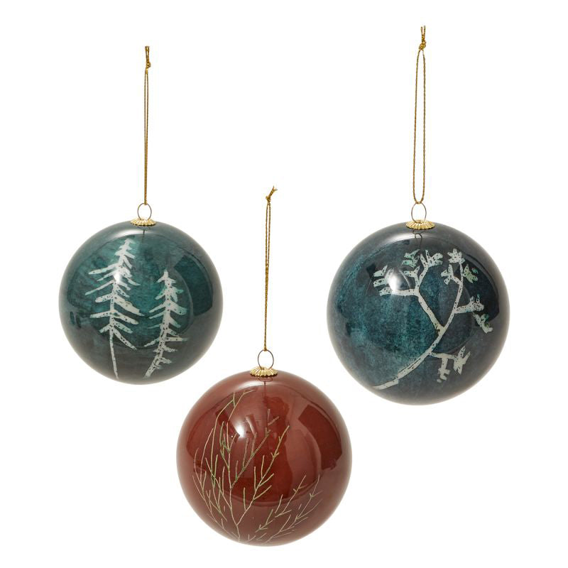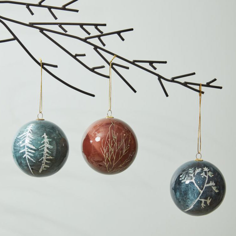 Hand painted elements of nature are printed on paper, wrapped around a ball, and coated in resin to create a beautiful dimensional effect. Lightweight, with a gold cord loop, the Brinley ornament brings an earthy pop of color to the holiday tree.