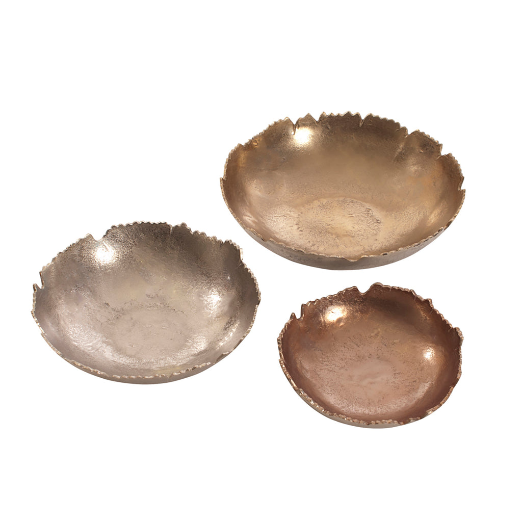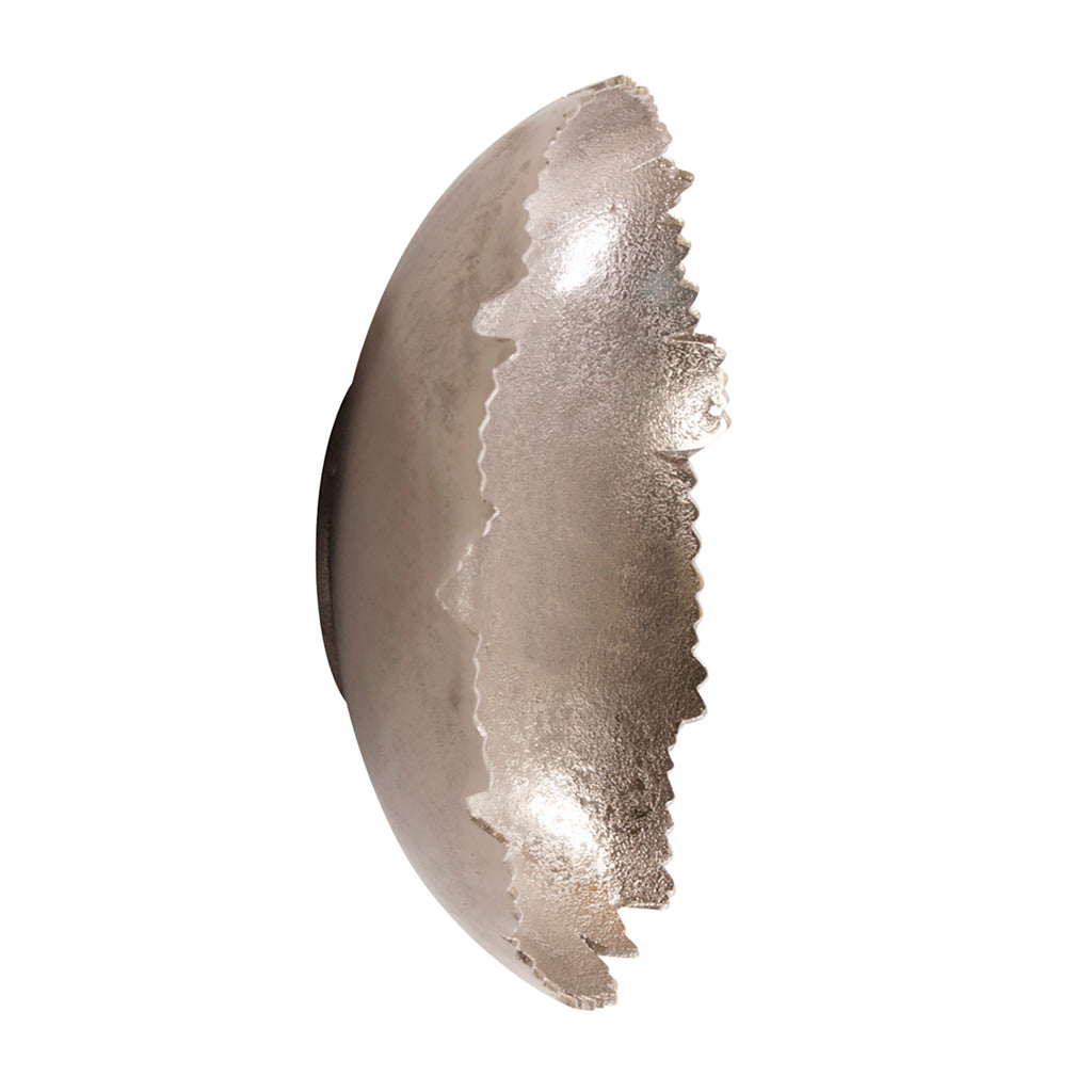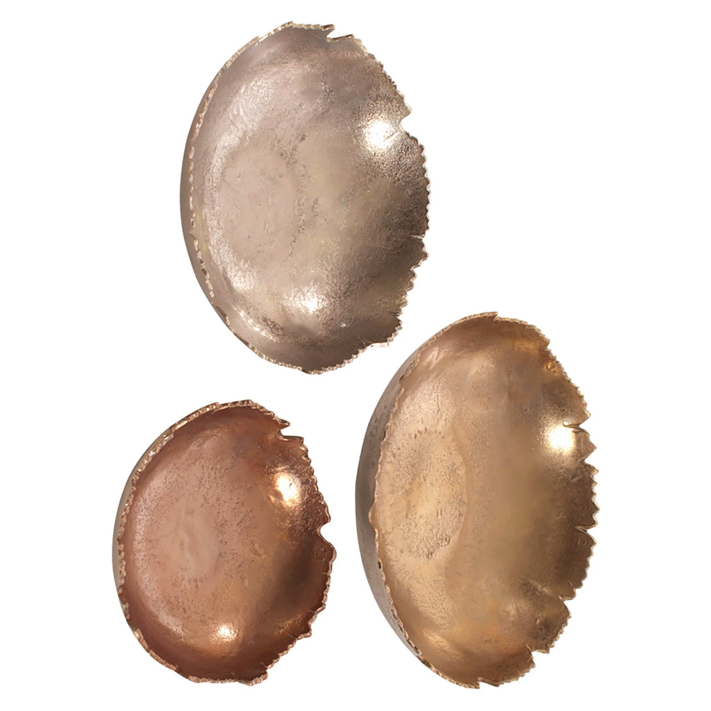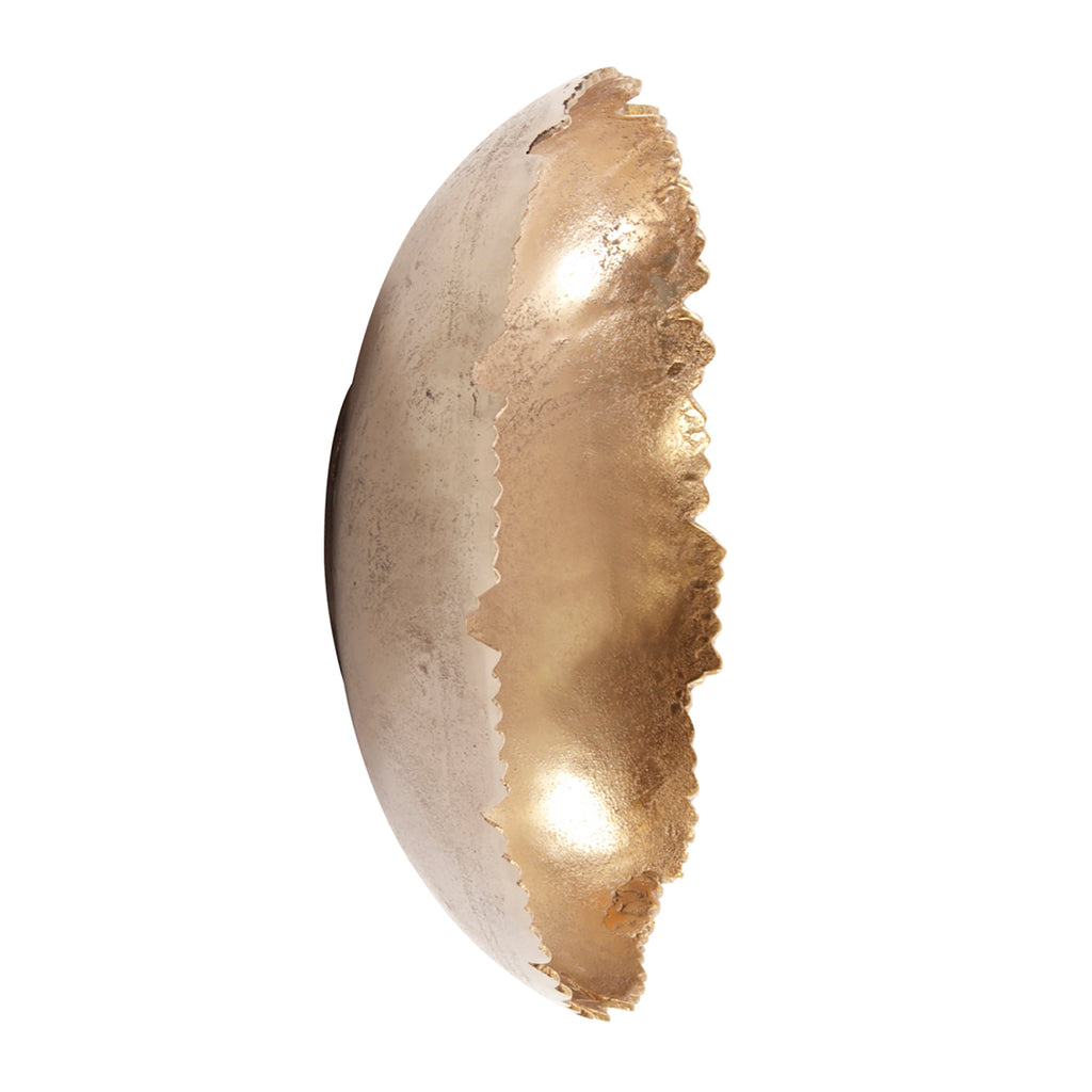 This unique bowl is fashioned from metal and features "torn" edges. It is finished with a bright metallic on the outside, while the inside of the bowl is finished in a bright metallic copper. Console tables, book shelves, desks or any other place that an accent is needed, are the perfect places for this decorative bowl. But that's not all! This piece comes with hardware so that you can hang it on the wall for a sculptural wall art piece! For decoration only.