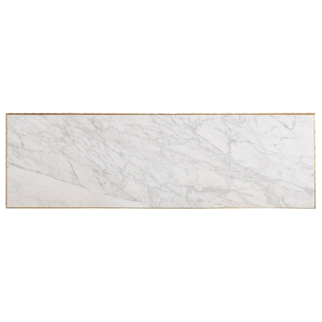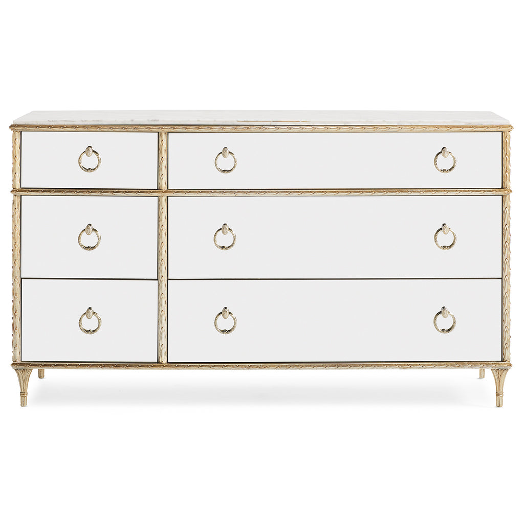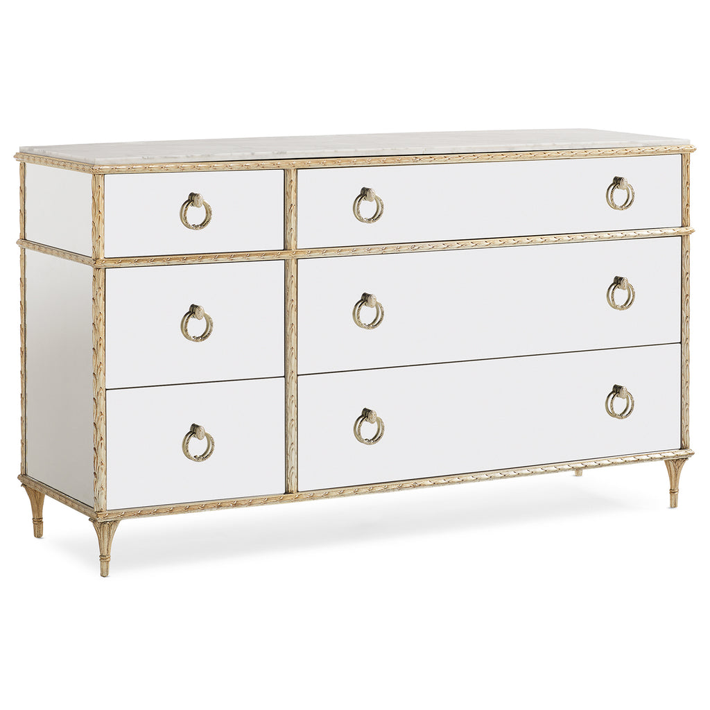 Exuding one-of-a-kind style, this elegant double dresser draws inspiration from the timeless beauty of antique Baroque picture frames. Richly carved laurel leaf motifs are brought to life in an Aglow finish surrounding this nightstand’s exquisite mirrored exterior. Six spacious drawers offer generous storage for your wardrobe and are fully finished in a soft Crème De La Crème. As functional as it is fashionable, this distinctive dresser also features a ¾-inch Carrara white marble top that adds durable functionality while reflecting its classic design roots. As you appreciate the offset placement of its mirrored drawers, you’ll notice custom-designed ring pulls with vintage cameo buttons reflected in splendor.