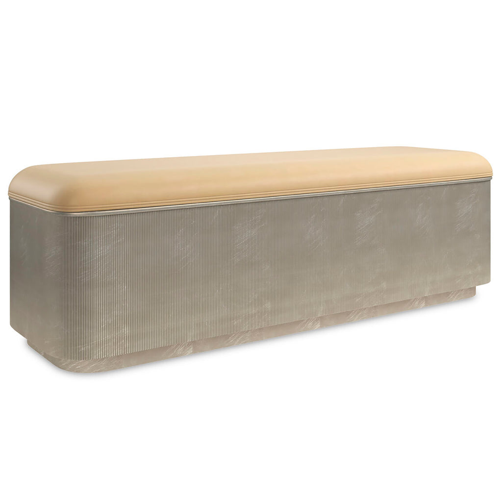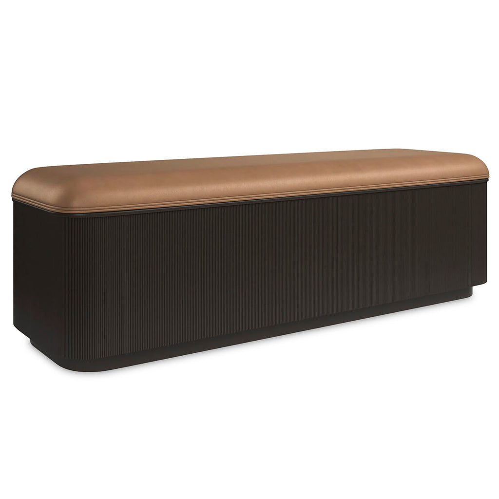 Storage has never felt so fashionable than with this luxe storage ottoman. Its lovely fluted exterior is highlighted in Dark Chocolate. Upholstered in Camel pebbled leather, its top seat cushion opens to reveal lighted storage with one tray on the left side. The bench has metal feet in Whisper of Gold. Use it on its own or as a pair in nearly any room for a touch of signature style.