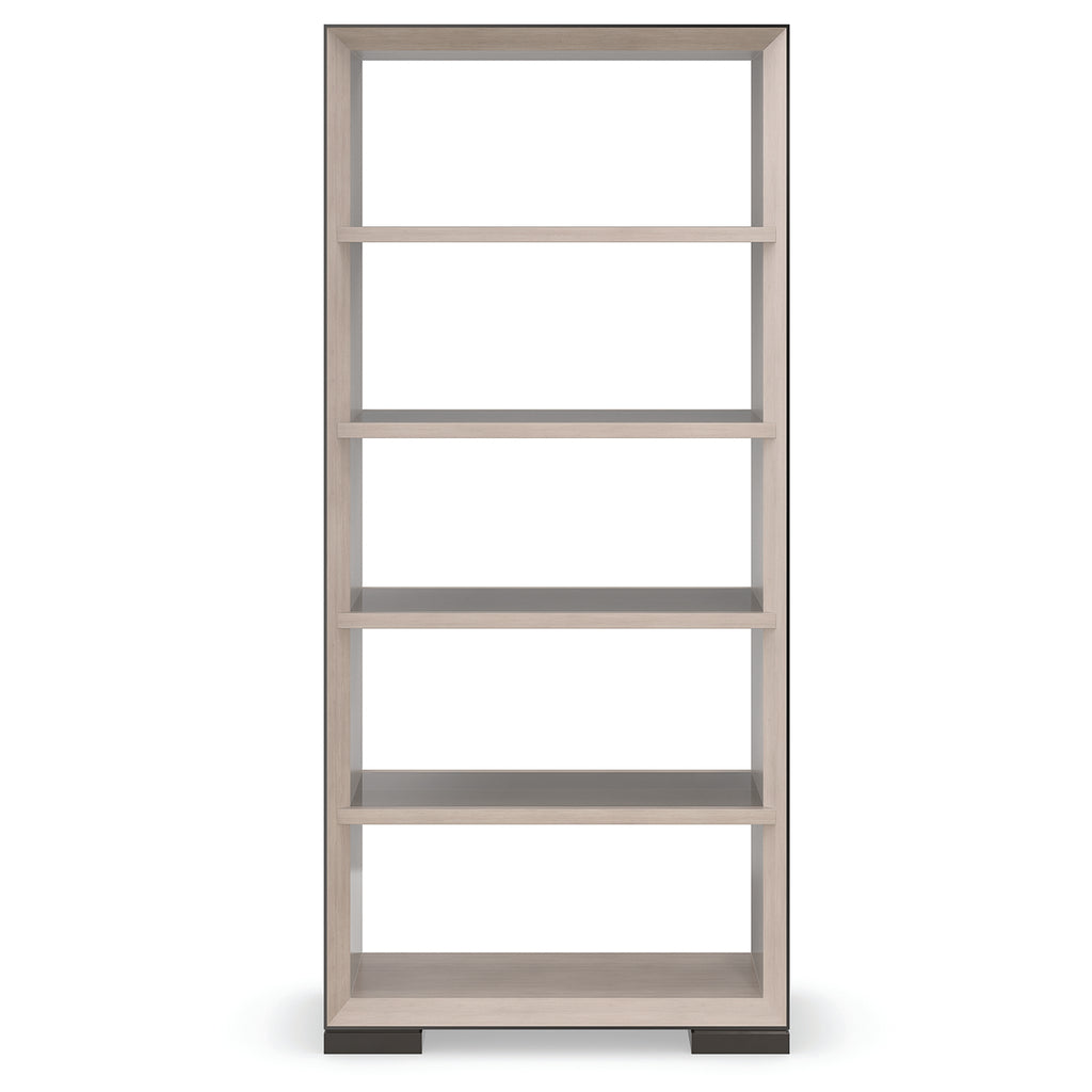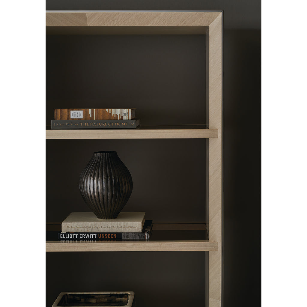 A study in contemporary form and functionality, this bookcase merges the natural beauty of wood with the reflectivity of glass and metal. Trimmed in Deep Bronze metal, its beveled frame is crafted in Koto veneers, finished in Moonstone to highlight the intricately pieced, linear wood grains. For an elevated take, it features four wood-framed shelves inset with Bronze glass. Use it to add height in a room, or style in multiples to create a curated, classic library aesthetic.