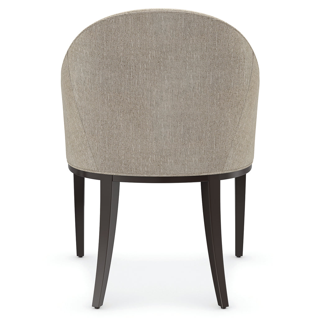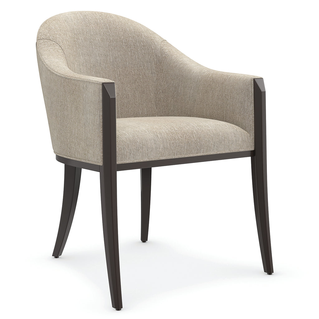 Warm and welcoming in a silver textured woven, this dining chair invites guests to linger around the table. Comfortably curved with a refined barrel back, it features sloping slim arms, accentuated by a faceted post in a richly contrasting Dark Chocolate finish. A classic seating silhouette that compliments today’s dining interiors with effortless elegance