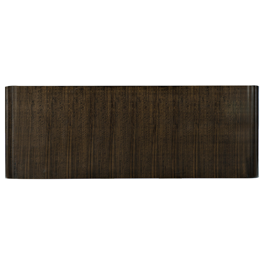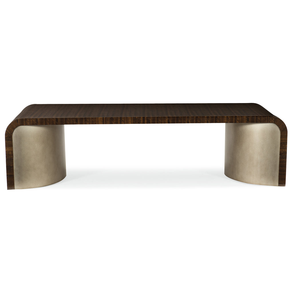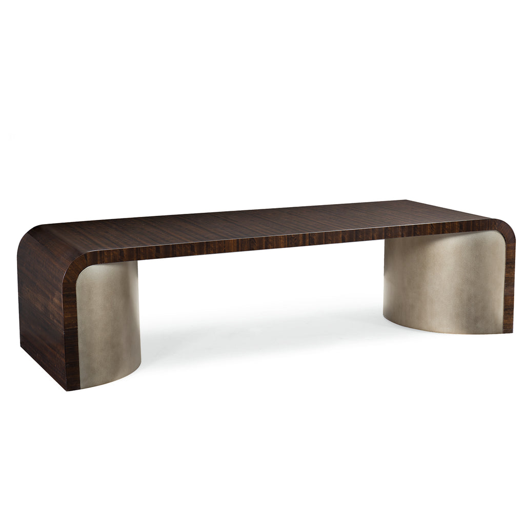 Fumed figured eucalyptus wood, finished to a high sheen in luscious Aged Bourbon, wraps the top of this rectangular table that is void of sharp angles. Two large, half-moon-shaped pedestals support the piece and are covered in Smoked Bronze. The smooth, elegant curves of this cocktail table will not be forgotten.