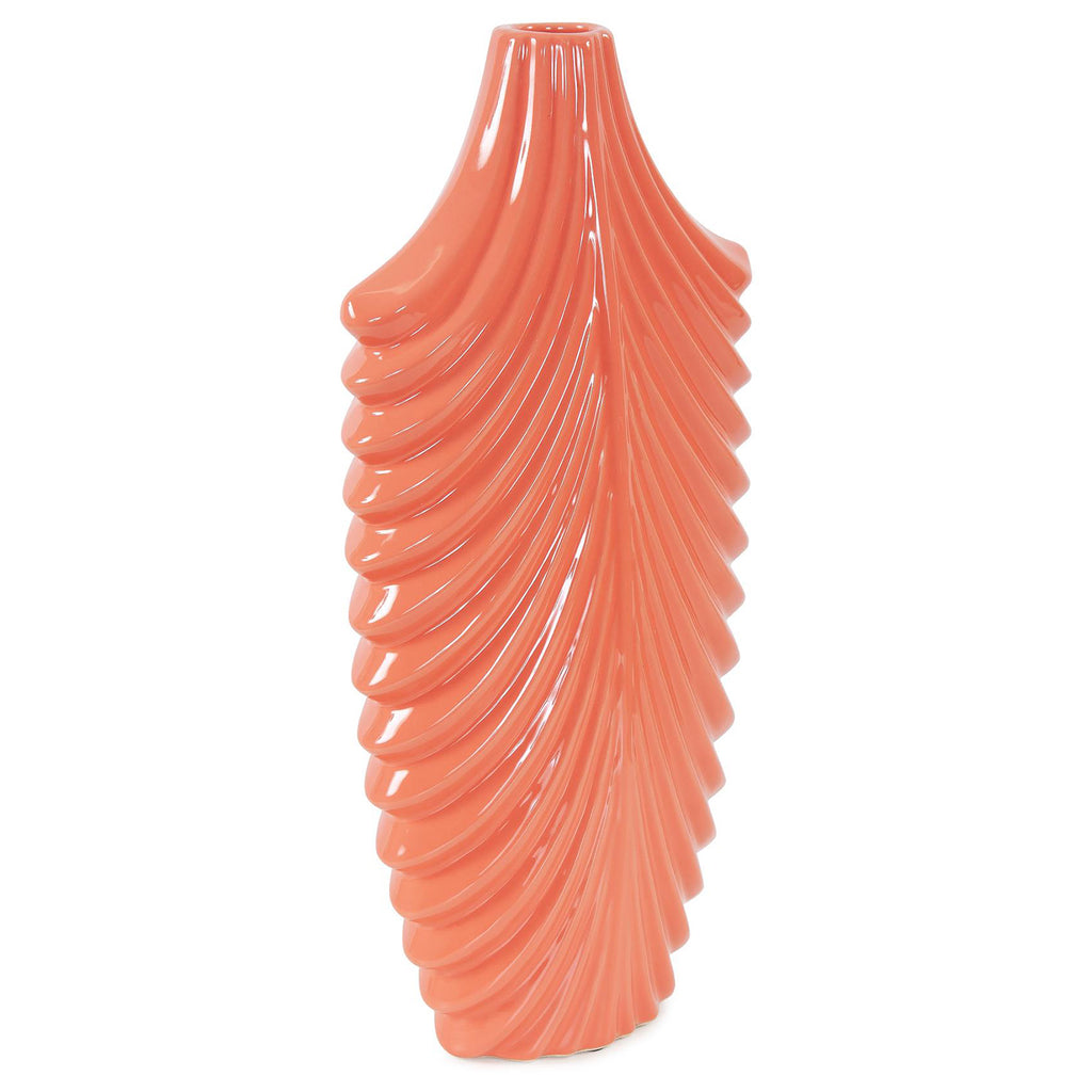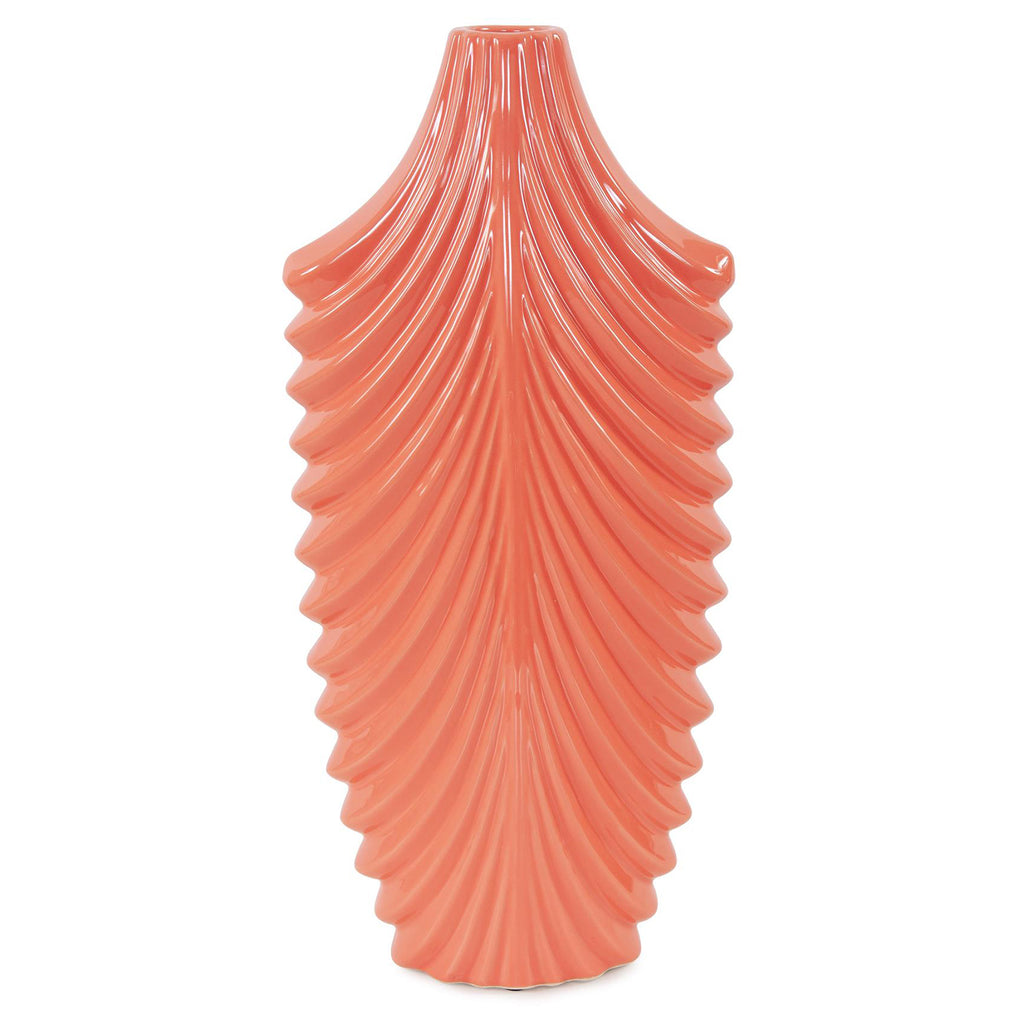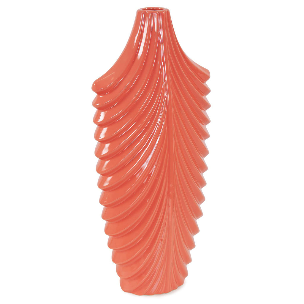 The creation of the Coral Reef ceramic vases and tray was inspired by vintage ceramics of the early 1920's. Each piece has a glamorous draping effect pattern, that was finished by hand in a glossy light coral so to highlight the deep texture. The Coral Reef Short vase makes a strong statement on its own anchoring a display in your home or as a functional vessel filled with flowers.