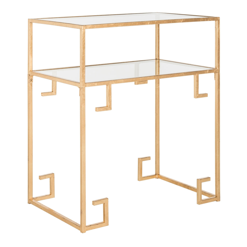 Inspired by the ages-old Greek Key motif, this sophisticated accent table is graphic yet strikingly simple. Crafted with a solid iron base in antique gold leaf finish, it has a glass top and self for magazines, books or collectible decorative objects.