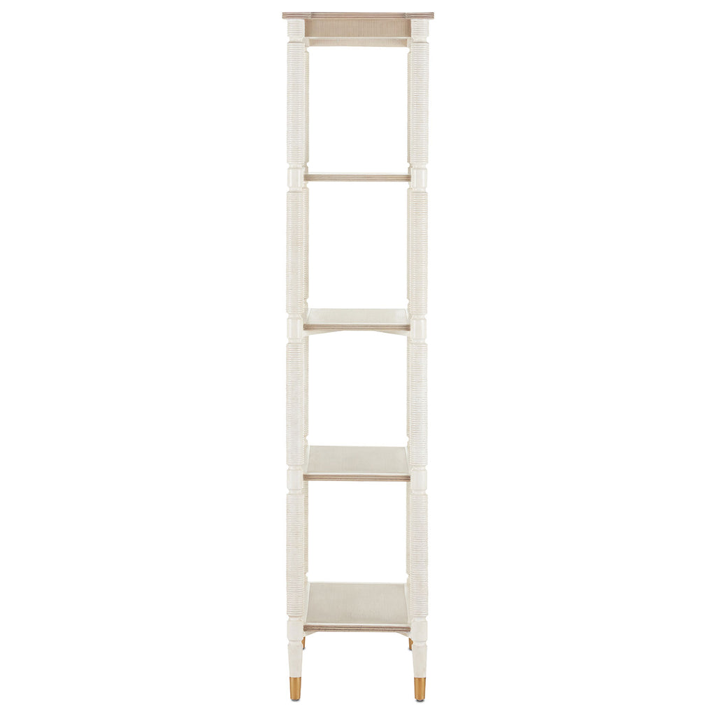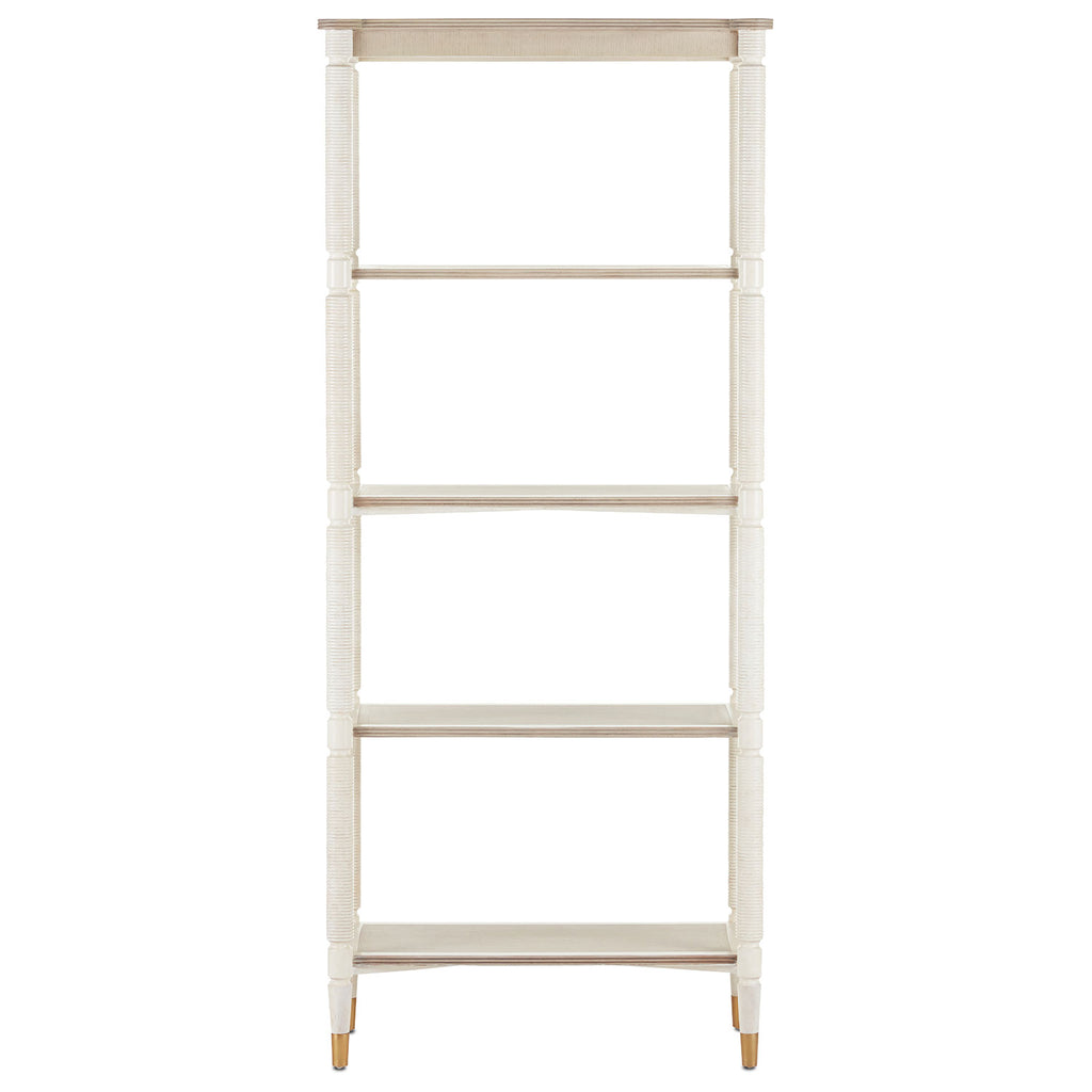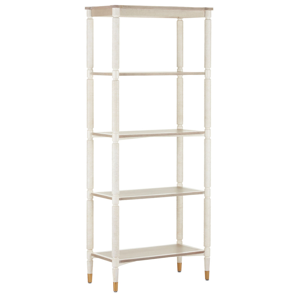 Made of mahogany and oak in a mix of off-white and Fog finishes, the Currey & Co Aster Etagere was inspired by an antique from the Winterthur Museum. The gray and white etagere has three shelves and is fitted with brass ferrules that are warm accents in a brass finish.