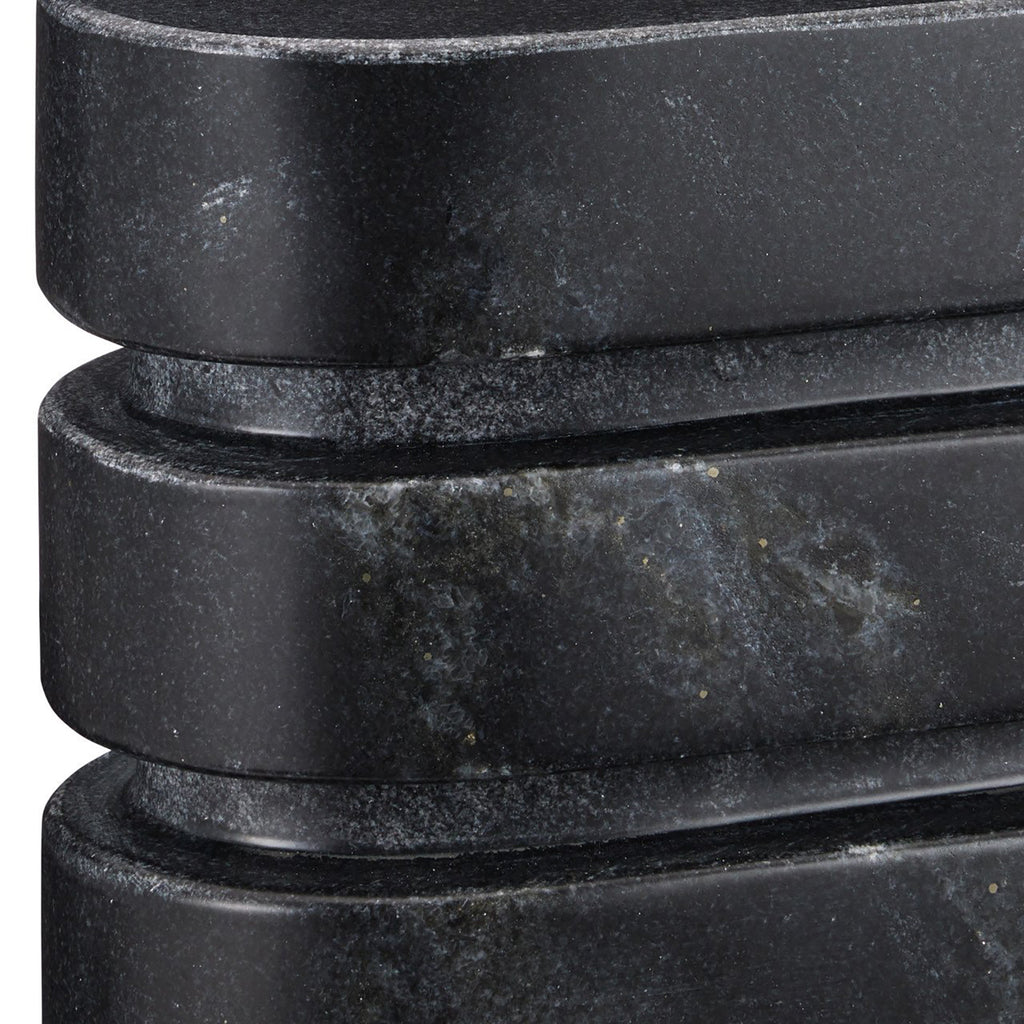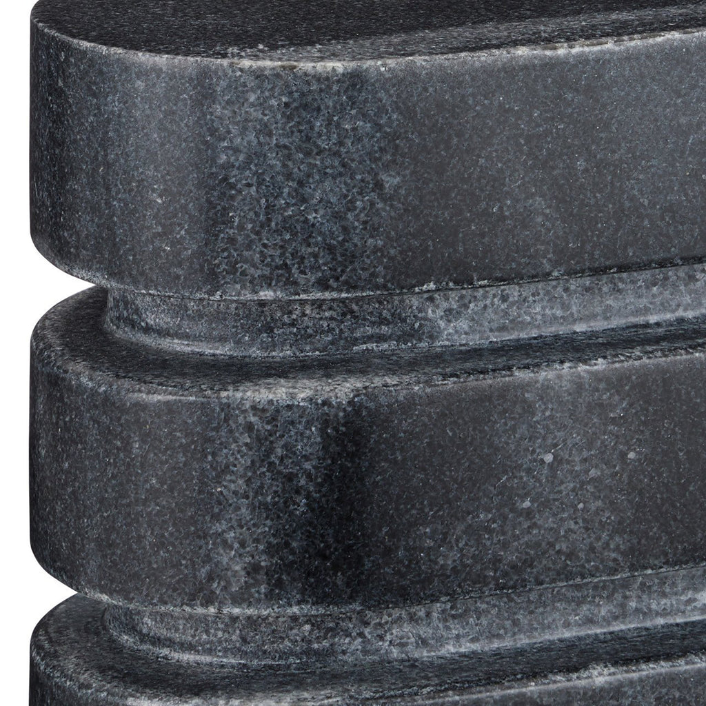 The Bheslana Marble Black Object Set includes two sculptures made of their namesake stone to bring the pieces subtle hints of patina. The veining that creates personality on the outer surfaces makes each of the decorative accessories unique. Rather brutalist in style, these are perfect decorative objects for contemporary interiors.