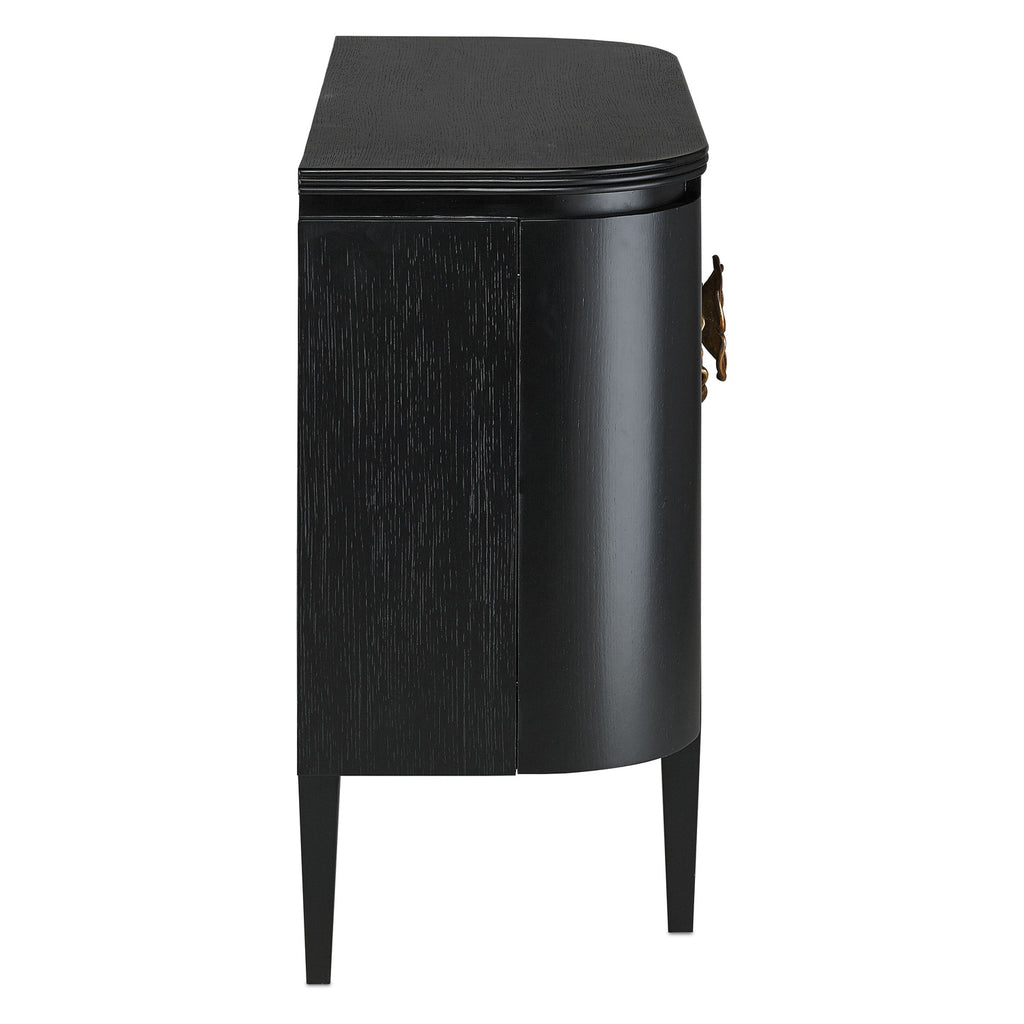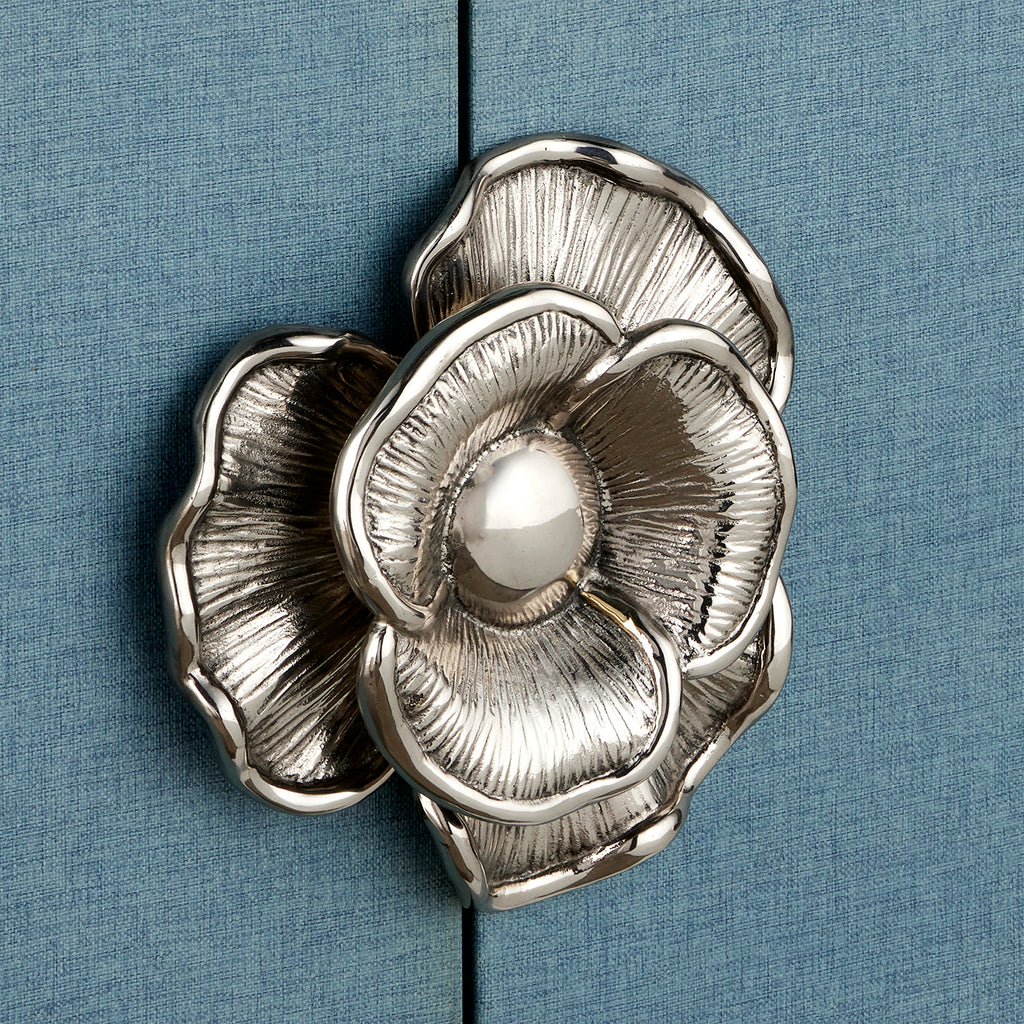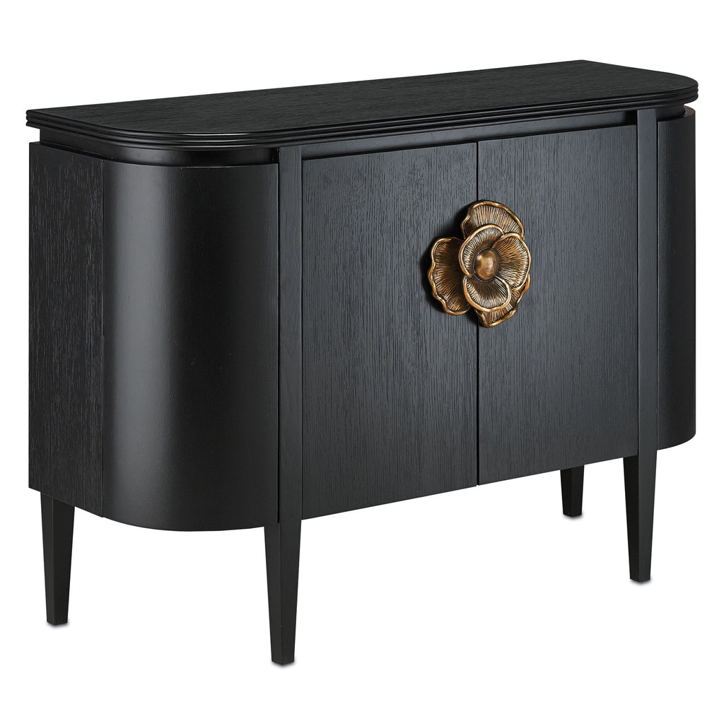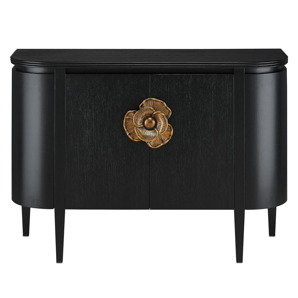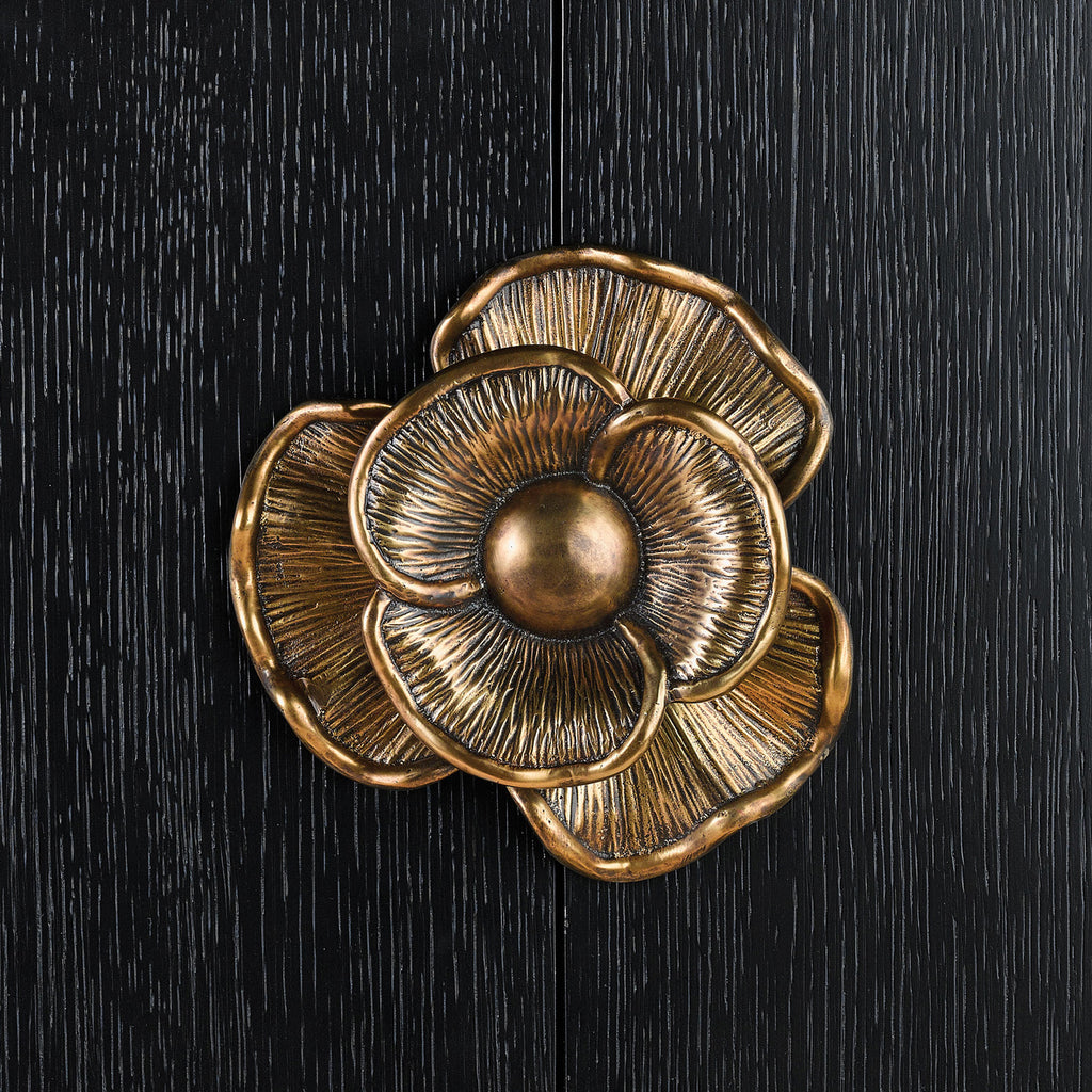 Stunning in its simplicity of lines and its artful hardware, the Briallen Demi-Lune has an elegant winter gray or caviar black stained wood and an impressively sized cast aluminum flower pull in steals the show. The stylized floral accent that serves as the pull makes this cabinet a bit of haute couture for a space. Design details include soft-close door hinges and adjustable glides. Place it in a beautifully designed boudoir for its form and function.